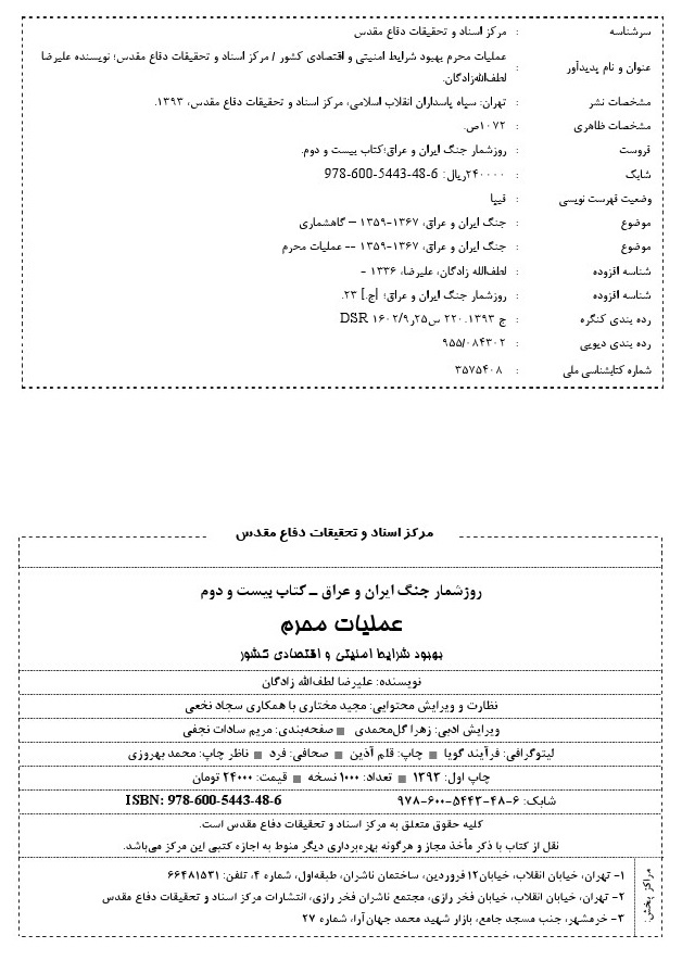 مشخصات نشر : تهران: سپاه پاسداران انقلاب اسلامی،مرکز اسناد و تحقیقات دفاع مقدس، 1393.