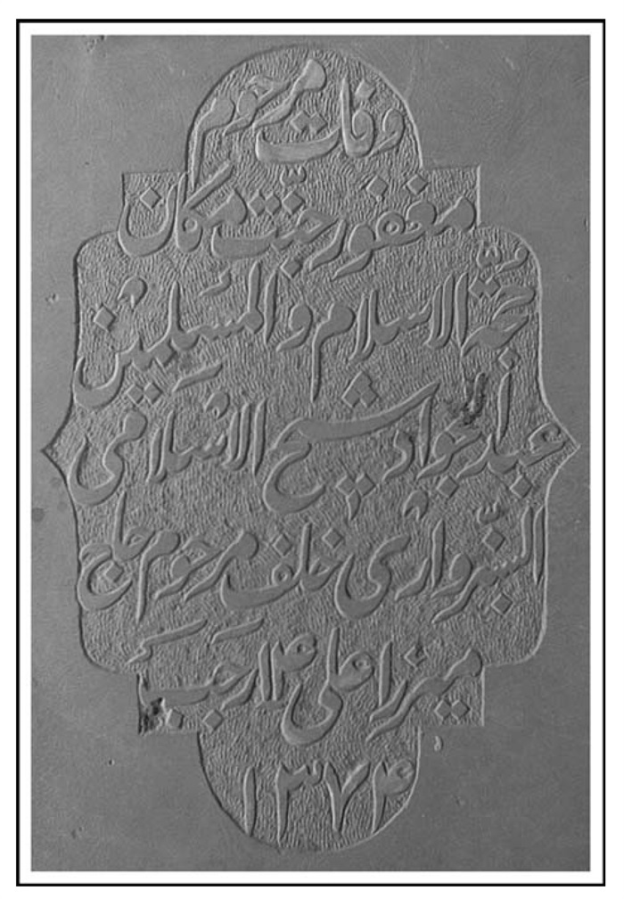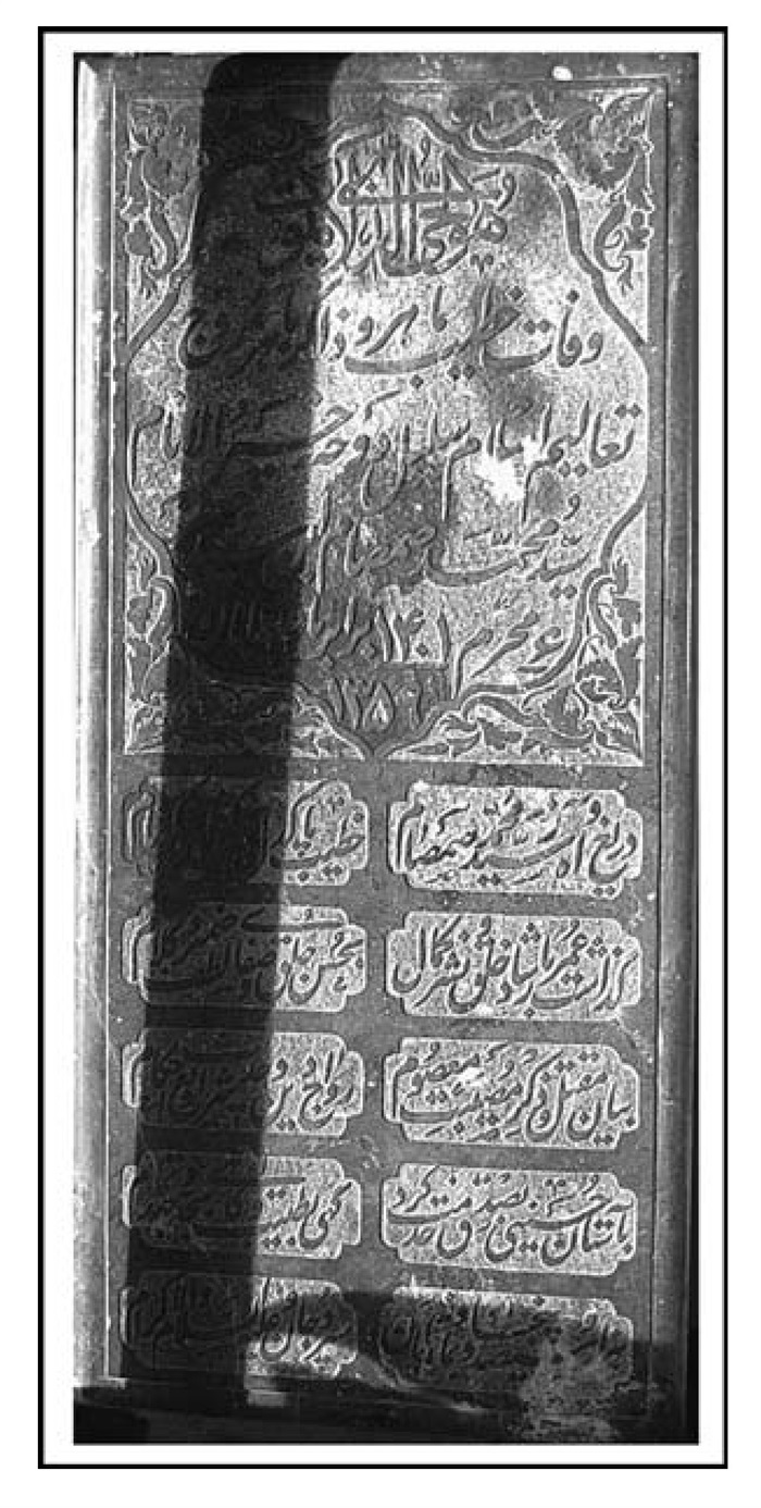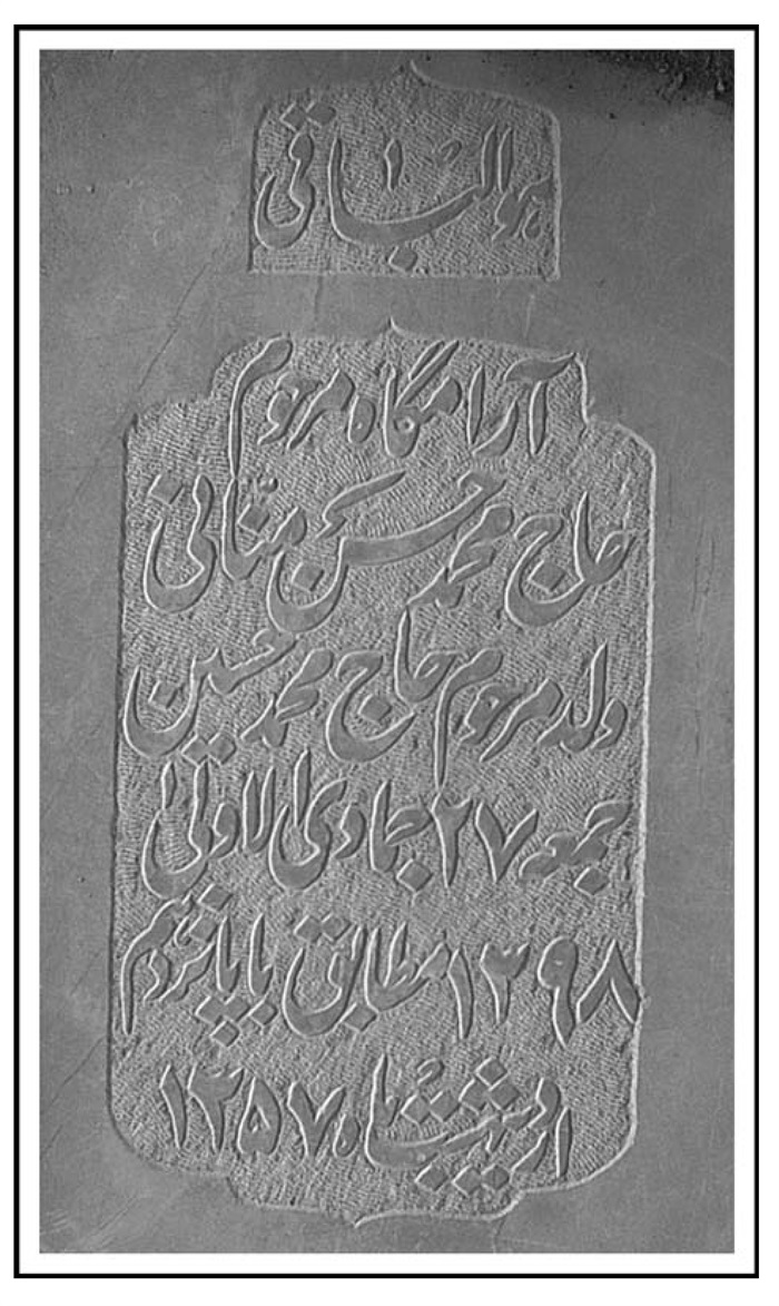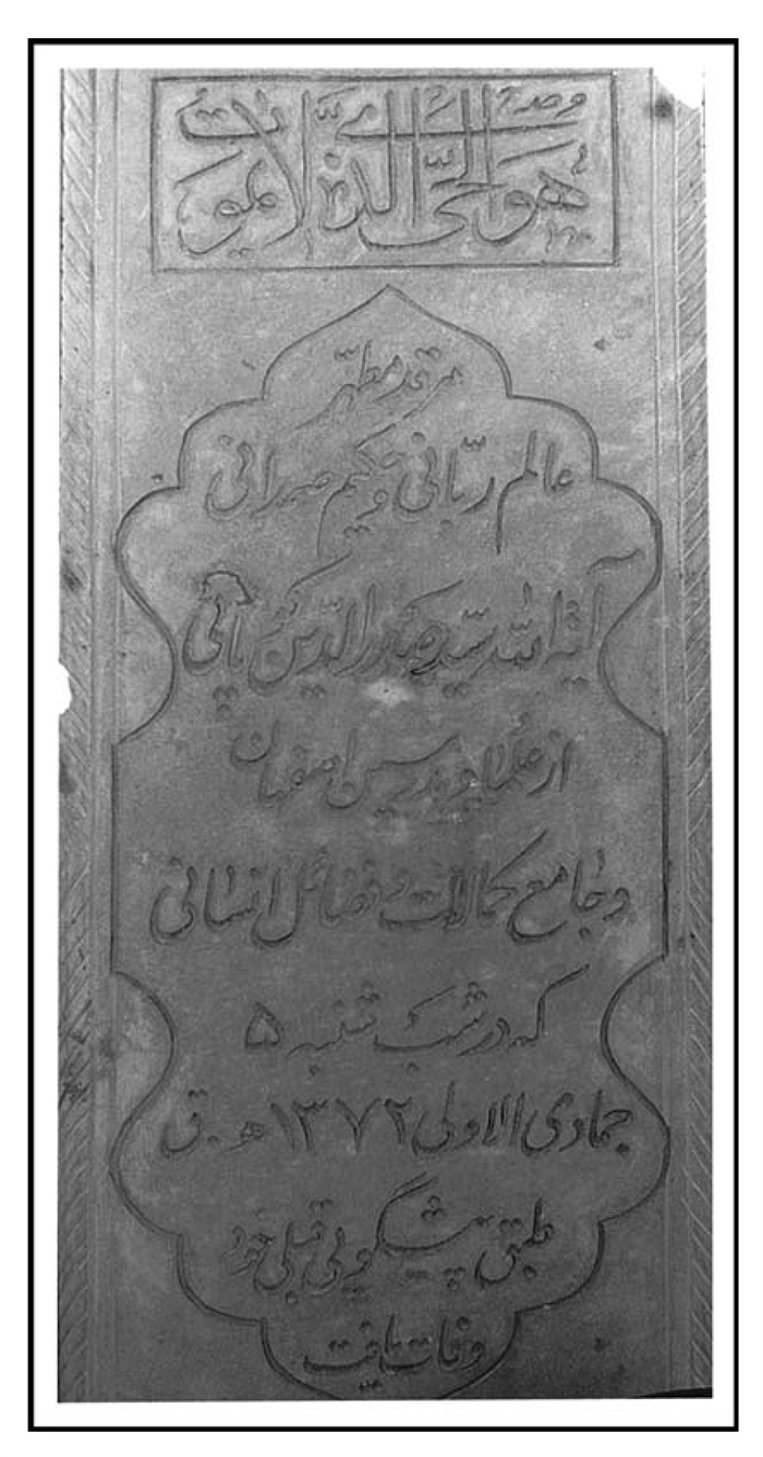 آرامگاه مرحوم جنت مکان خلد آشیان العابد السعید الزاهد الفقید العارف السید صاحب المناقب و المفاخر السید محمد باقر اعتصامی رهنانی خیاط اصفهانی فی پنج شنبه بیست و هشتم شهر صفر 1379.