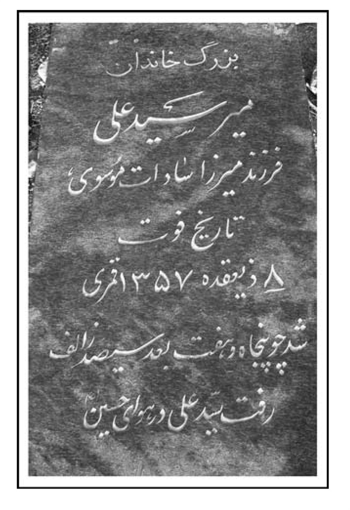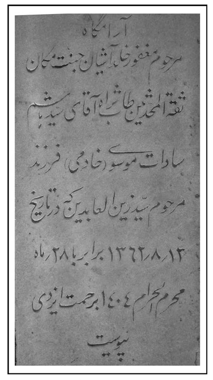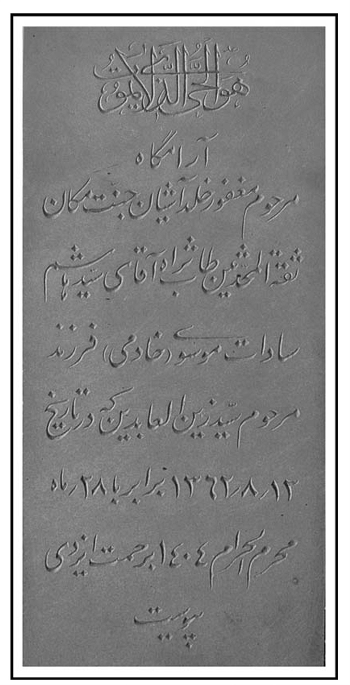 آرمگاه شادروان مرحوم مغفور ادیب فاضل و خیر، حاج سیّد فخرالدین موسوی فریدنی فرزند مرحوم خیر الحاج میر محمّدعلی طاب ثراهما بتاریخ روز دوشنبه هیجدهم بهمن ماه 1361 برابر با 23 ربیع الثانی 1403ه. ق.