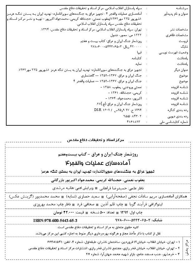 مشخصات نشر : تهران: سپاه پاسداران انقلاب اسلامی، مرکز اسناد و تحقیقات دفاع مقدس، 1394.