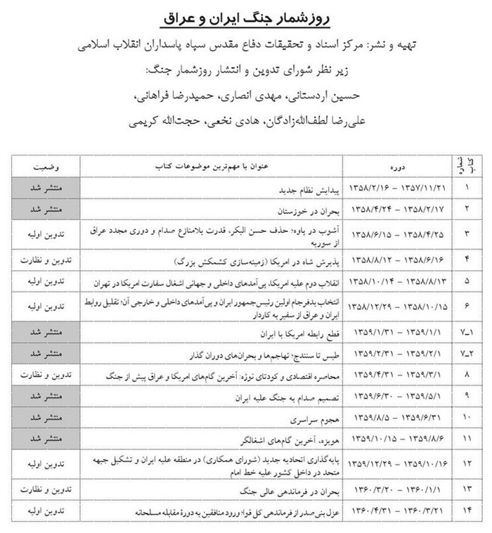 یادداشت : زیر نظر شورای تدوین و انتشار روزشمار جنگ حسین اردستانی، مهدی انصاری، حمیدرضا فراهانی، علی رضا لطف الله زادگان، هادی نخعی، حجت الله کریمی.