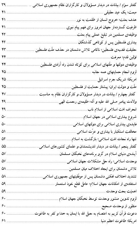 بجز اینها، فهرست امکانات امّت اسلامی، مشتمل بر صدها عنوان و سرفصل برجسته ی انسانی، فرهنگی، مادی و اقتصادی، سیاسی و اجتماعی است که هر کسی با ژرف بینی و بازنگری می تواند از آن آگاه شود.