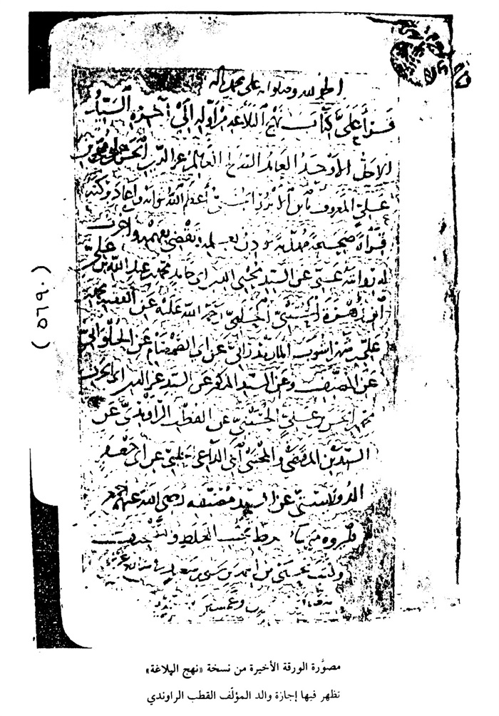 الأصحاب ، عن الشیخ الإمام محمّد ، بن السعید بن هبة الله ، الراوندیّ ، وهو یرویها عن والده القطب الراوندیّ.