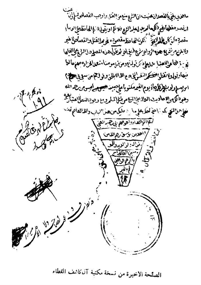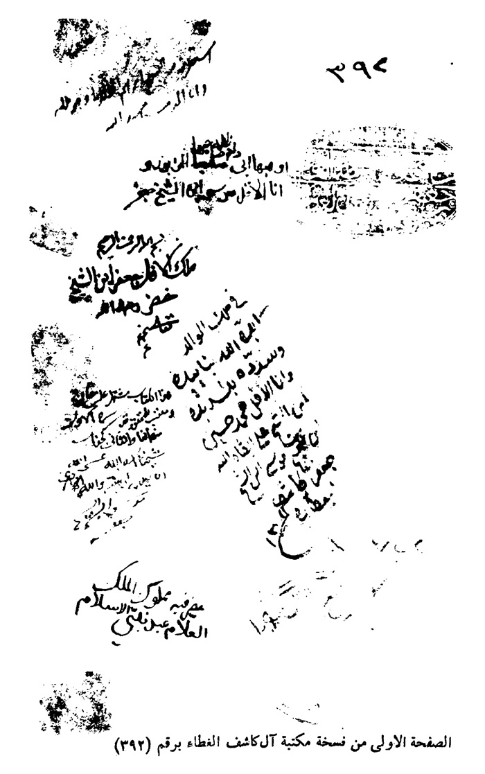وفی مواضع منها اجازة من الشیخ علی بن الحسین بن عبد العال العاملی الشهیر بالمحقق الکرکی المتوفی ( 0 و 94 ) بتاریخ ( 932 ). وعلیها خط ابن فهد الحلی ( المتوفی 841 ) وخط شرف الدین البحرانی الیزدی.