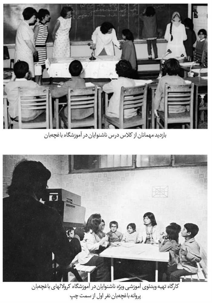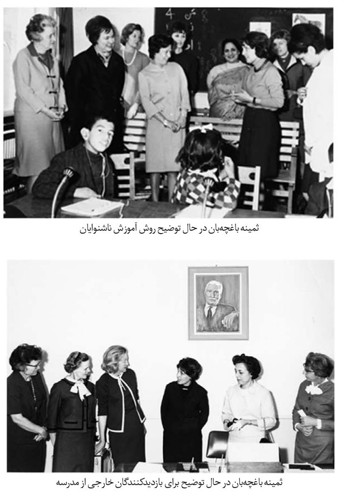 جبار باغچه بان و ثمینه باغچه بان در حال گفتگو با کودک ناشنوا در حضور بازدیدکنندگان از مدرسه باغچه بان، دی ماه 1338