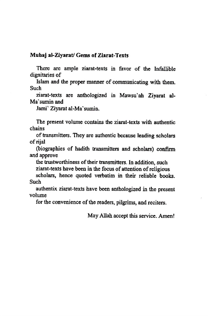 یادداشت:پشت جلد لاتینی شده: Muhaj al- ziyarat= gems of ziarat- texts.
