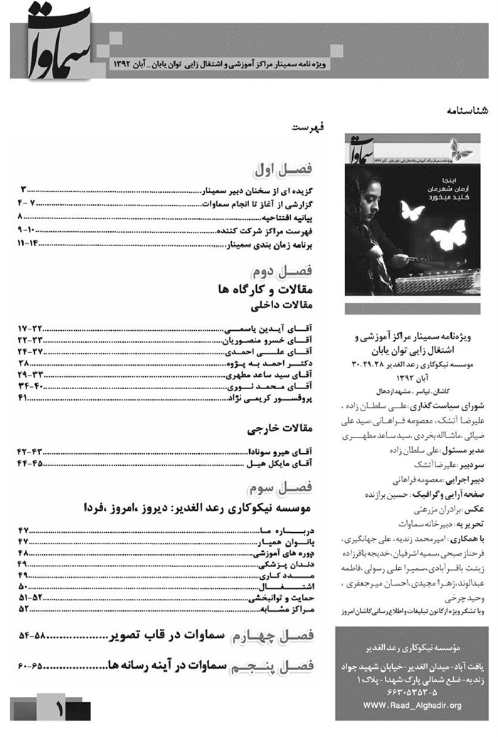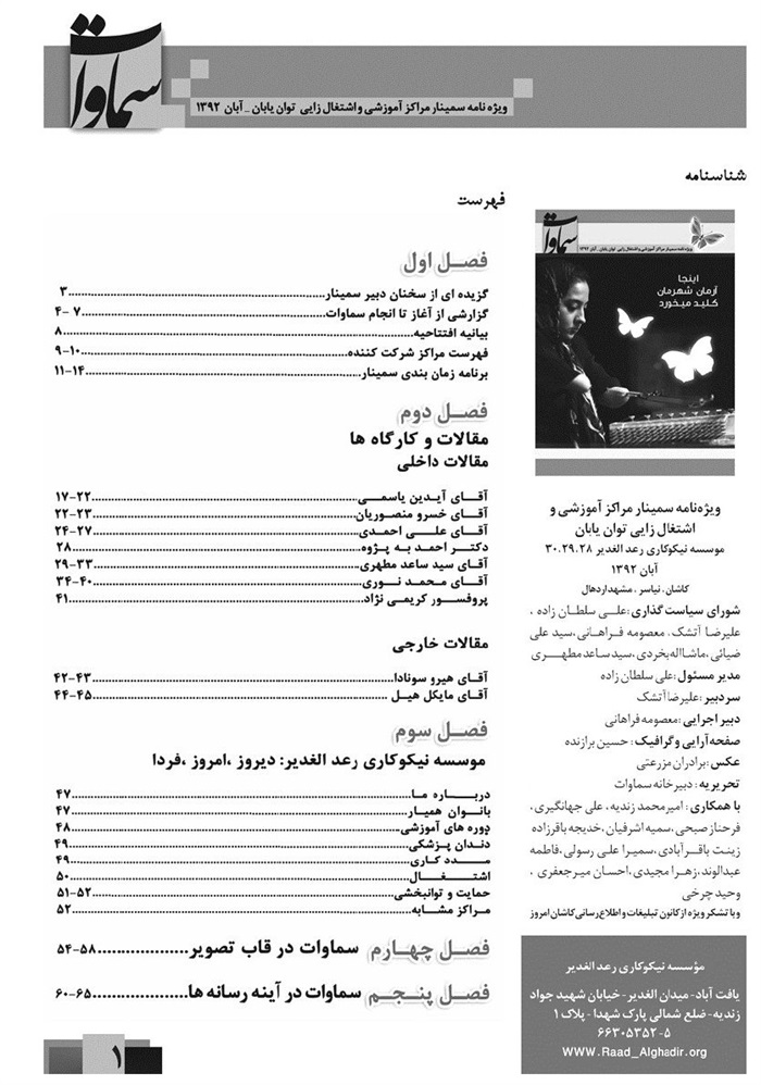 ویژه نامه سمینار، مراکز آموزشی، اشتغال زایی توان یابان سماوات، تهران، آبان، 1392.