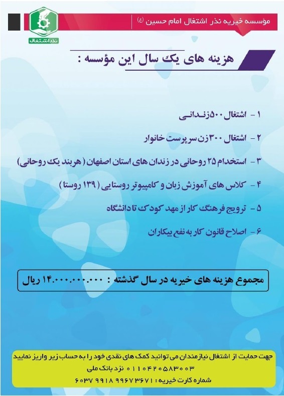 شناسه افزوده:موسسه خیریه نذر اشتغال امام حسین(علیه السلام)