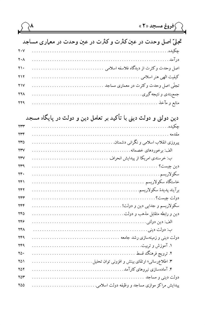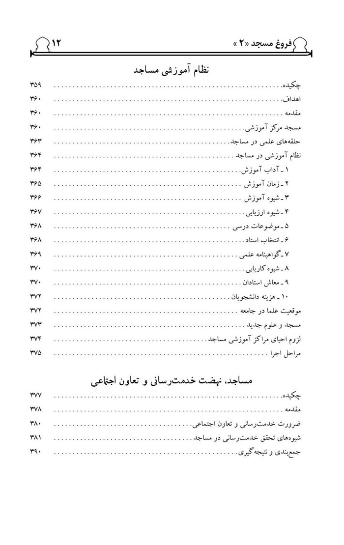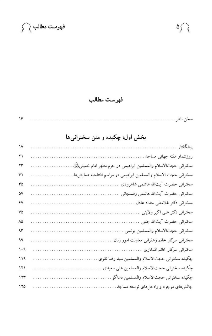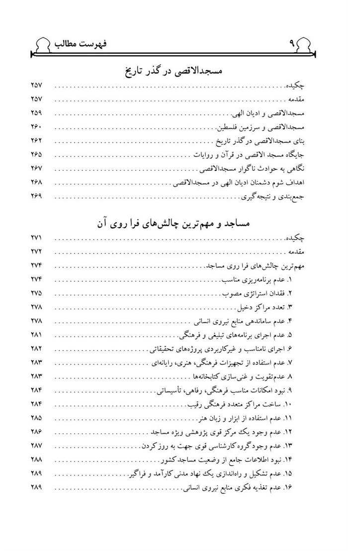نخست چکیده و متن سخنرانی شخصیت های بزرگوار علمی، سیاسی کشور در دومین سلسله همایش های بزرگداشت هفته جهانی مساجد است که در پایان این بخش نکات مطرح شده در سلسله همایش ها جمع بندی، و چالش های موجود و راه حلهای آن ارایه شده است و در بخش دوم، چکیده و متن مقالات برگزیده تقدیم شده است.