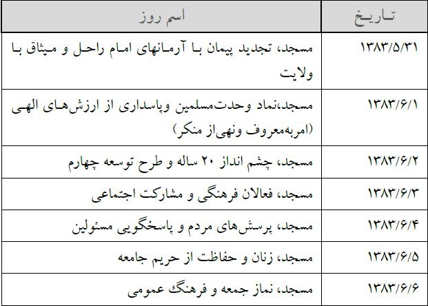 روزهای مختلف هفته بزرگداشت جهانی مسجد برابر تصویب کمیته علمی ستاد بزرگداشت هفته جهانی مساجد با عناوین ذیل نام گرفت و متناسب با آن، برنامه های ویژه ای در هر روز برگزار گردید.
