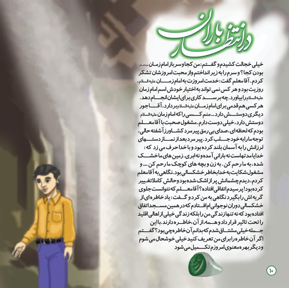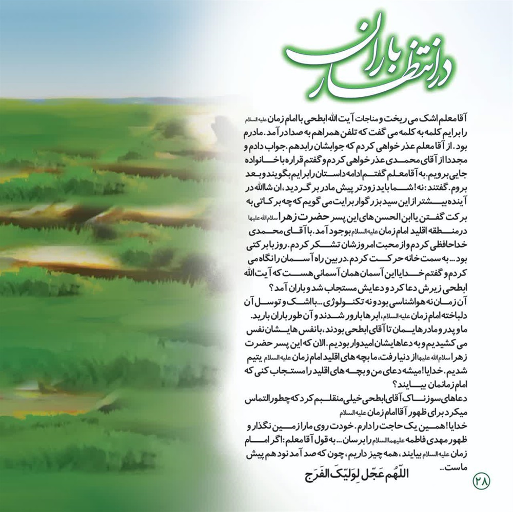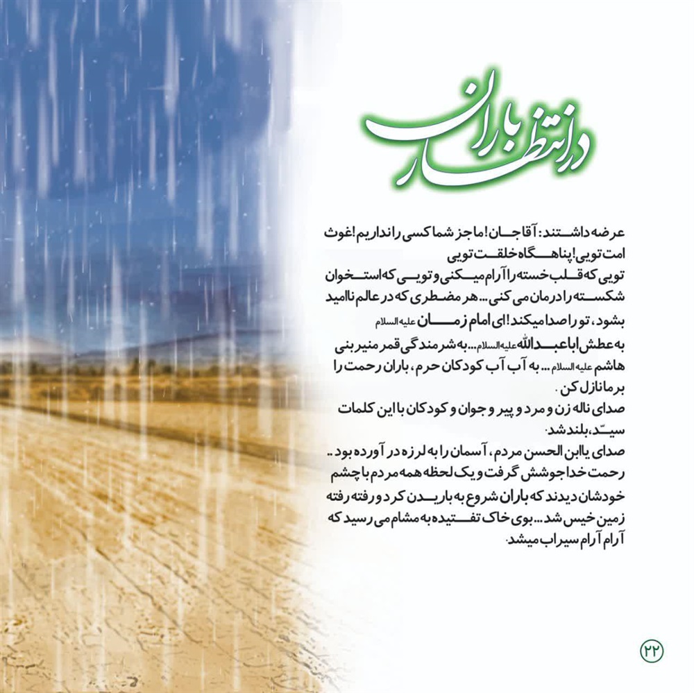 نام کتاب: درانتظار باران / پدیدآورندگان : جمعی از ارادتمندان و دلباختگان نجات بخش عالم بشریت حضرت بقیة الله الاعظم امام زمان عجل الله تعالی فرجه الشریف