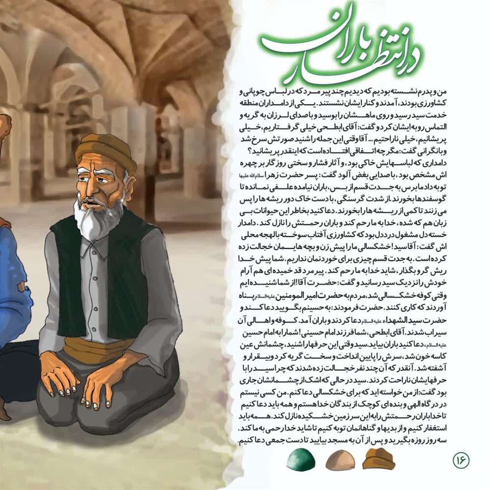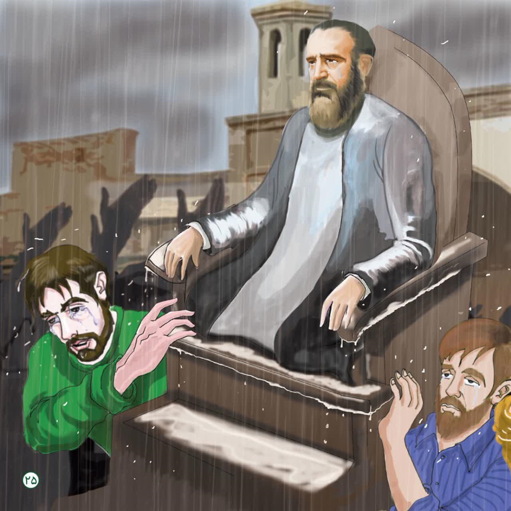 از شدت گرسنگی، با دست خاک دور ریشه ها را پس می زنند تا کمی از ریشه هارابخورند.دعاکنید بخاطر این حیوانات بی زبان هم که شده ، خدا به مارحم کند و باران رحمتش را نازل کند. دامدار خسته دل مشغول درددل بود که کشاورزی آفتاب سوخته بالهجه محلی اش گفت: آقاسید!خشکسالی مارا پیش زن و بچه هایمان خجالت زده کرده است. به جدت قسم چیزی برای خوردنمان نداریم. شماپیش خدا ریش گرو بگذار، شاید خدا به ما رحم کند. پیرمرد قد خمیده ای هم آرام خودش را نزدیک سید رسانید و گفت:حضرت آقا!از شما شنیده ایم وقتی کوفه خشکسالی شد، مردم به حضرت امیر المومنین علیه السلام پناه آوردند که کاری کنند.
