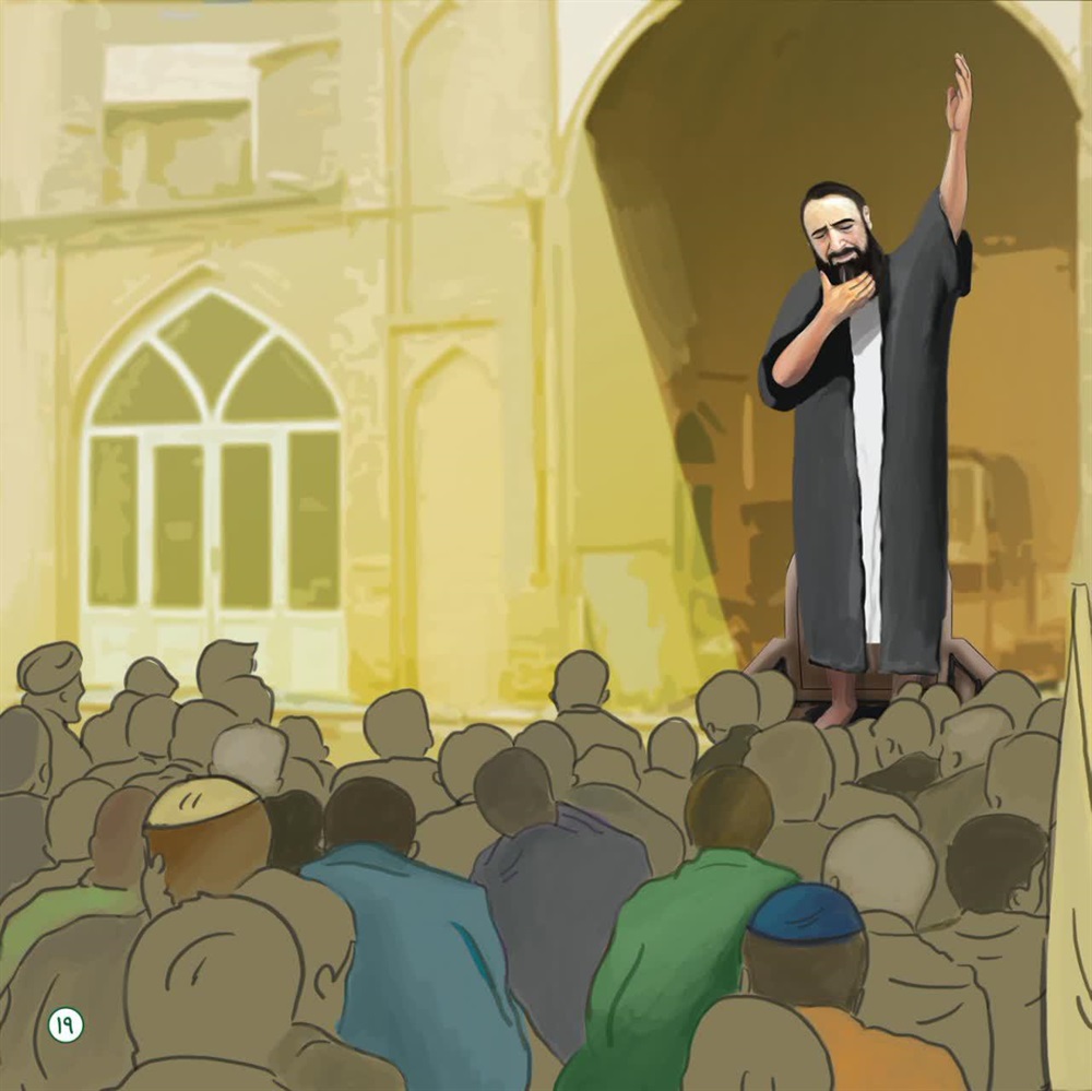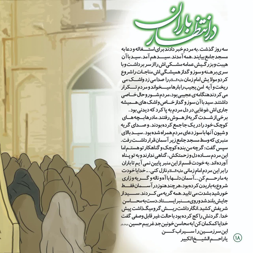 سه روز گذشته به مردم خبر دادند برای استغاثه ودعابه مسجدجامع بیایند.همه آمدند.سیدهم آمد.سید با آن هیبت و بزرگیش عمامه مشکی اش را از سر برداشت و با سری برهنه و سوز و گداز همیشگی اش مناجات راشروع کرد و مولایش امام زمان علیه السلام را صدا می زد واشک می ریخت و آیه امن یجیب را بارها میخواند و مردم تکرار می کردند هنگامه ی عجیبی بود، مردم شور و حال خاصی داشتند.سید با آن سوز و گداز خاص و اشک های همیشه جاری اش غوغایی در دل مردم به پا کرد که دیدنی بود. برخی از شدت گریه از هوش رفتند. مادرها بچه های کوچک خود را در یک جا جمع کرده بودند. و صدای گریه و شیون آنها باسوز دعای مردم همراه شده بود. سید بالای منبری که وسط مسجد جامع زیر آسمان قرار داشت رفت. سپس گفت: