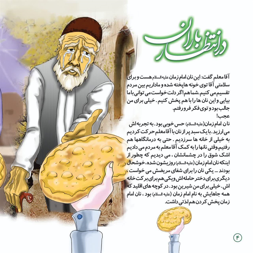 بایک سبد پر از نان با آقامعلم حرکت کردیم به خیلی از خانه ها سر زدیم. حتی به درمانگاه ها هم رفتیم. وقتی نان ها را به کمک آقا معلم به مردم می دادیم اشک شوق را در چشمانشان ، می دیدیم که چطور از اینکه نان امام زمان (علیه السلام) روزیشون شده، خوشحال بودند ... یکی نان را برای شفای مریضش می خواست ، دیگری برای دخترحامله اش ویکی هم برای برکت خانه اش.