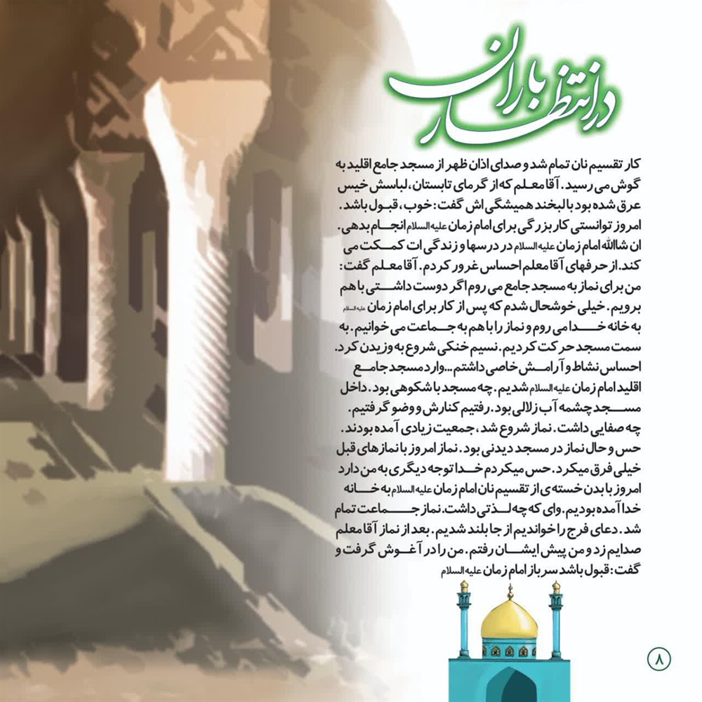 من برای نماز به مسجد جامع می روم اگر دوست داشتی باهم برویم. خیلی خوشحال شدم که پس از کار برای امام زمان علیه السلام به خانه خدا می روم و نماز را با هم به جماعت می خوانیم. به سمت مسجدحرکت کردیم. نسیم خنکی شروع به وزیدن کرد. احساس نشاط و آرامش خاصی داشتم.