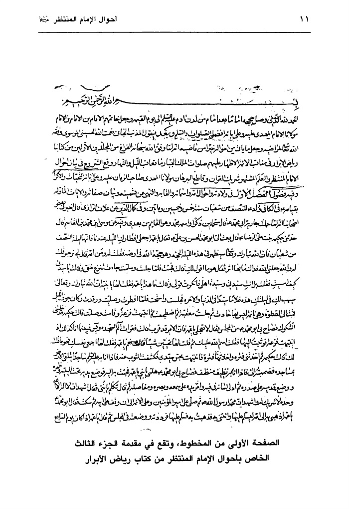 لحمد لله الذی وصل حججه إماماً بعد إمام من لدن آدم (علیه السّلام) إلی یوم القیامه، وجعل خاتمهم الإمام ابن الإمام ابن الإمام، مولانا الإمام المهدی علیه وعلی آبائه أفضل الصلوات والسلام.