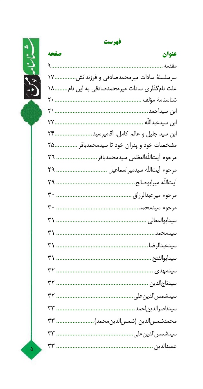 سرسلسلۀ سادات میرمحمدصادقی و فامیل های وابسته، مثل مدرس، مدرس هاشمی، مدرس مطلق، .... و طیب...) ، از سید جلیل القدر، آقا میر محمدباقر شروع می شود. یعنی همۀ سادات از آقا میرمحمدباقر، اجدادشان یکسان و واحد هستنداست؛ اما تا آقا میرمحمدباقر حداقل دست کم سه یا چهار نسل فاصله است که اجداد با هم متفاوت هستند. در واقع، همه عموزاده هستند؛ از این رو جهت چند صفحۀه اول کتاب را سفید رها نمودم کردم که تا هر فرد، نام خود و پدر و جد و جد بزرگ خود را تا آقا سید میرمحمدباقر پیدا کند و در این شناسنامه با توضیح احوال آن ها ثبت و ضبط نمایدکند.