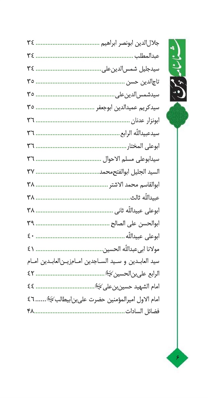 می خواهم باید بدانیم که هرچه هست و نیست، همه از تقوای و بندگی خدای عظیم و رحیم حاصل می شود و اگر علم، و ریاست، و ثروت، و حسب و نسب عالی باشد، اما تقوای و ترس از خداوند مهربان و خالق یکتا در کار نباشد، به پول سیاهی نمی ارزد. غرض اصلی حقیر در تألیف این کتاب همین این است که: آباء و اجدادمان را بهتر بشناسیم، و در راه تقوای و مبارزه با نفس اماره، و کسب علم و دانش، و نام نیک به دست آوردن و بندگی خدای خالق کردن از آن ها پیروی نموده کنیم، و با کسب معارف الهی بر عزت و شوکت این سلسلۀه جلیله بیفزاییم اضافه کنیم و مایۀ افتخار شویم برای آینده گانمان. و همچنین، در روز جزا هم در پیشگاه حضرت رسول(صَلَّى اَللَّهُ عَلَيْهِ وَ آلِهِ) و اجداد معصوممان(علیهم السلام) و مادر حضرت زهرا(علیها السلام) (سلام اللّه علیهم اجمعین) خجول و شرمنده نشویم.لازم به ذکر این مطلب لازم است که چند صفحه در اول کتاب را سفید قرار داده ام تا هرکدام هریک از زن و مرد از سادات محترم، زن و مرد، نام خود و پدر و پدربزرگ و جد خود را اضافه نمایند کنند و در