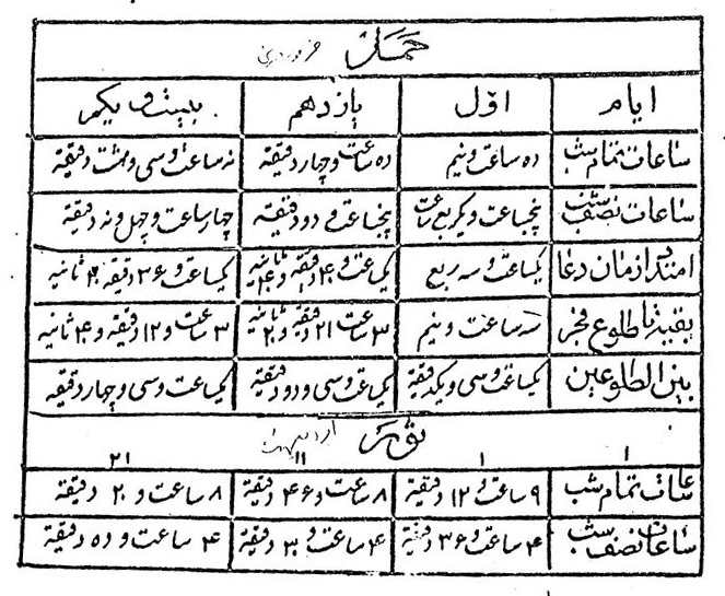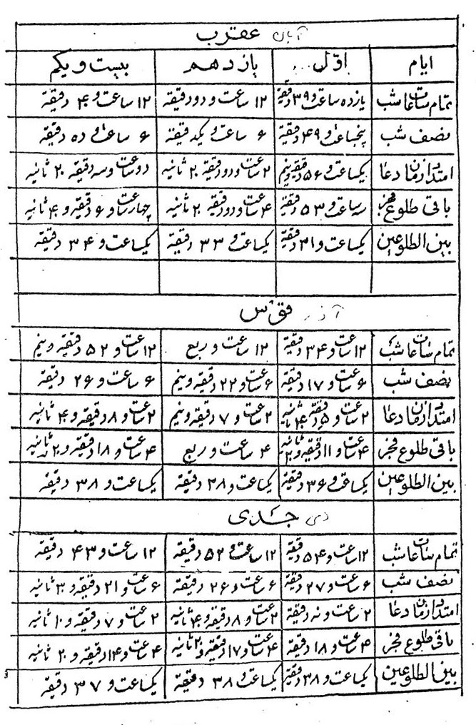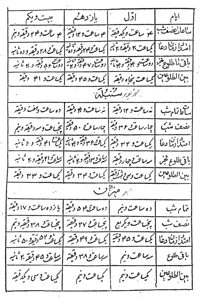 بدانکه مقصود از شبی که ائمه اطهار صلوات علیهم اجمعین بیان فرموده اند و احادیث و اخبار از ایشان رسیده ظهور دارد که شب از غروب آفتاب تا طلوع فجر صادق است و آن از جهت اختلاف فصول و بروج مختلف می شود از جهت بلندی و کوتاهی پس بهترین قاعده برای تعیین اوقات شب اینست که نسبت بهر برجی از بروج دوازده گانه تعیین شود تا تحقیقاً معلوم شود و شب زنده داران از دخول و خروج آن ساعات در شب از روی یقین باخبر باشند و از فیض آن بهره مند شوند لذا برای سهولت و آسانی از این جدول که راهنمای اوقات شب تماماً و ساعت نیمه شب و زمان امتداد دعا و باقیمانده تا طلوع فجر و مقدار بین الطلوعین تا اول آفتاب را یاد می کنیم و این برای اوقات شبهای دوره سال ثابت و غیر قابل تغییر است و بنای جدول روی دوازده برج است برای هر سالی