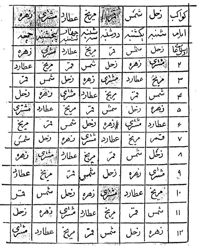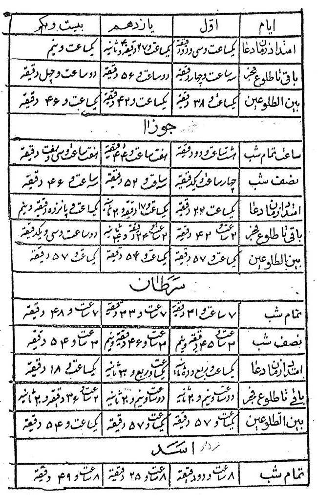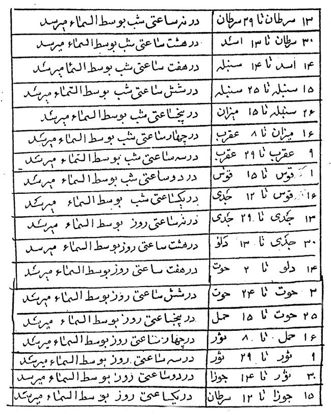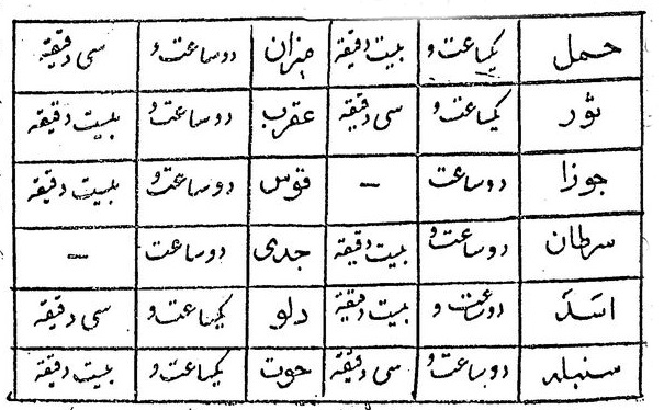 حمل یک ساعت و بیست دقیقه، ثور یک ساعت و سی دقیقه، جوزا دو ساعت، سرطان دو ساعت و بیست دقیقه، اسد دو ساعت و بیست دقیقه، سنبله دو ساعت و سی دقیقه، میزان دو ساعت و سی دقیقه، عرب دو ساعت و بیست دقیقه، قوس دو ساعت و بیست دقیقه، جدی دو ساعت، دلو