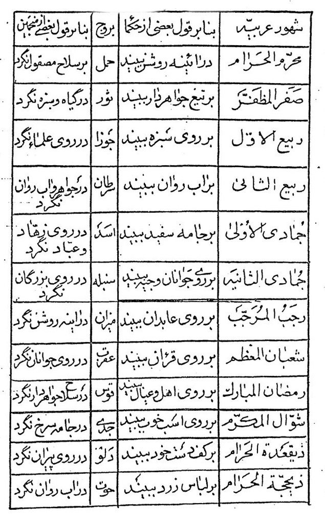 اگر خواهی بدانی آفتاب در کدام برج است و در کدام درجه است از سال های هجری نهصد و نوزده طرح کن آنچه باقیمانده در ده ضرب کن و محفوظ دار و از باقیمانده حصّه شتم را کن کن و آنچه باقی ماند دو عدد بر آن زیاد کن و با محفوظ جمع کن و حاصل جمع را محفوظ دوّم بنام و بعد سال هجری ناقص را ایام کن چنانچه محرم را سی و صفر را بیست و نه و بر همین قیاس تاآخر دوازده ماه قمری هر چند روز گذشته و محفوظ ثانی را از این ایّام بیرون کن اگر قابل وضع نیست دورهای شمسی را بر آن بیفزای تا قابل شود پس آنچه از طرح باقیمانده بحساب شعر معروف