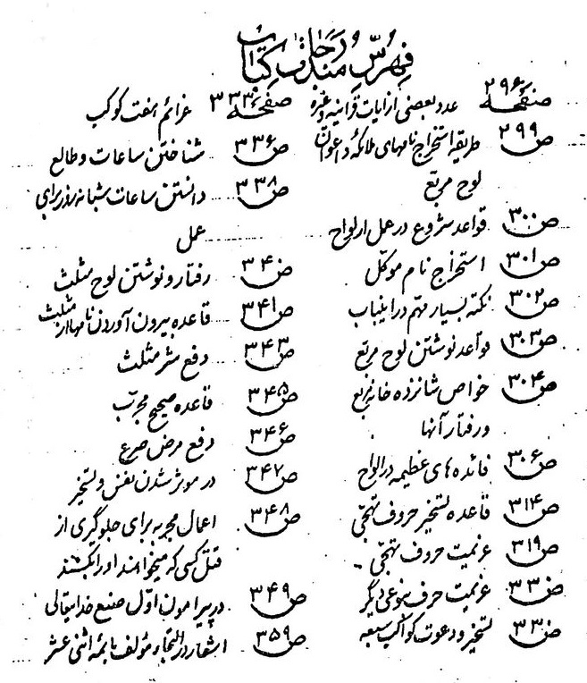 بگیر آنچه از ساعات روز گذشته و آنرا در پانزده ضرب کن و آنچه از ماه عربی گذشته بر او بیفزا یعنی بر حاصل ضرب و حاصل جمع هر دو را سی سی طرح کن و هر طرح سی را برجی ده هرچه باقی ماند که بسی نرسید آن درجه طالع است از بروج بنای حساب را بر آن بگذار و برای طرح ابتدا از برجی که آفتاب در آن است کن.