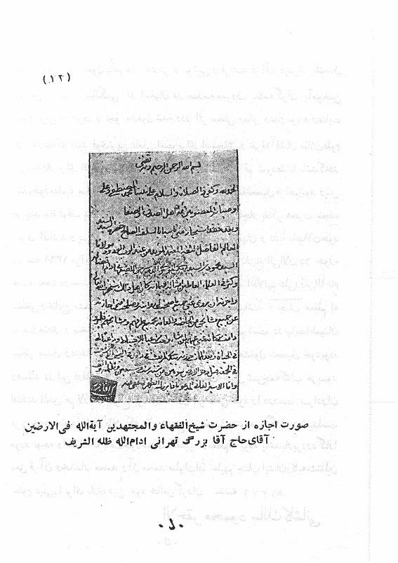 صورت اجازه از حضرت شیخ الفقهاء و المجتهدین آیه الله فی الارضین آقای حاج آقا بزرگ تهرانی ادام الله ظله الشریف