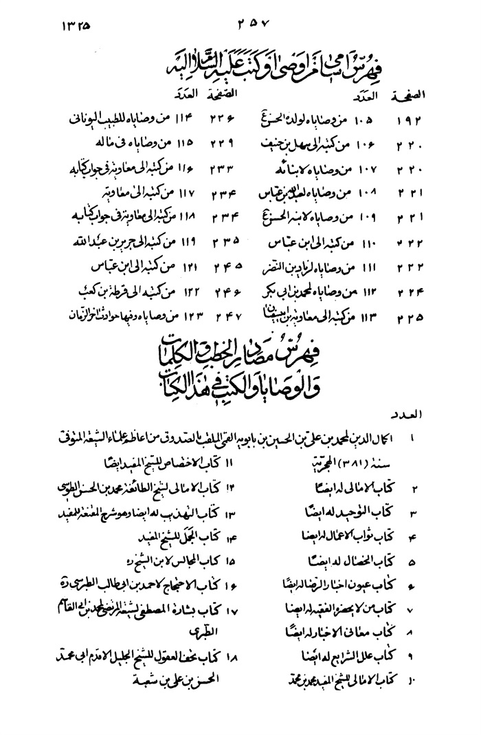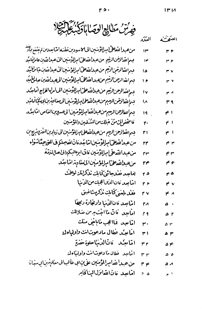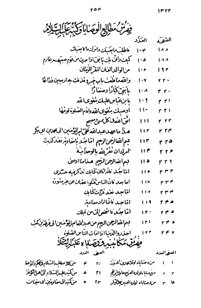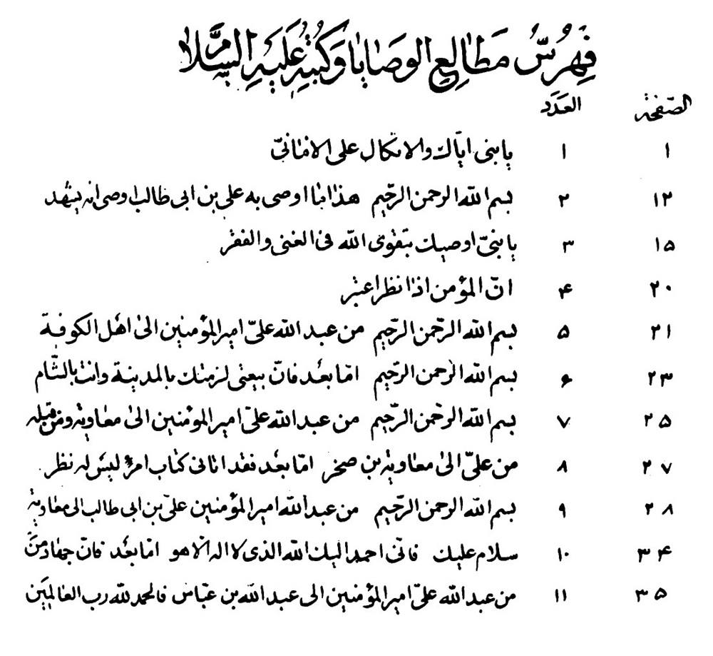 فروع الكافي في كتاب الوصايا رواها عن ابي عليّ الاشعريّ عن محمّد بن عبد الجبّار و محمد بن إسماعيل عن الفضل بن شاذان عن صفوان بن يحيي و في التهذيب لشيخ الطائفة عن الحسين بن سعيد عن صفوان بن يحيي عن عبد الرّحمن بن الحجّاج و اللفظ عن الكافي قال بعث اليّ ابو الحسن موسي عليه السّلام بوصيّّة امير المؤمنين عليه السّلام و هي بسم اللّه الرّحمن الرّحيم هذا ما اوصي به و قضي به في ماله عبد اللّه عليّ ابتغاء وجه اللّه ليولجني به الجنّة و يصرفني به عن النّار و يصرف النّار عنّي يوم تبيّض وجوه و تسوّد وجوه انّ ما كان لي من مال بينبع يعرف لي فيها و ما حولها صدقة و رقيقها غير انّ رياحا و ابا نيزر و جبيرا عتقاء اهاليهم و في التهذيب غير ابي رياح و ابي نيزر و جبير عتقاء ليس لاحد عليهم سبيل فهم مواليّ يعملون في المال خمس حجج و فيه نفقتهم و رزقهم و ارزاق اهاليهم وسع ذلك ما كان لي بوادي القري كلّه من مال لبني فاطمة و رقيقها صدقة و ما كان لي بديمة و اهلها صدقة غير انّ زريقا له مثل ما كتبت لاصحابه(و في التهذيب غير انّ رقيقها لهم مثل ما كتبت لاصحابهم)و ما كان لي باذينة و اهلها صدقة و القصيرة و العفرتين كما قد علمتم صدقة في سبيل اللّه و انّ الّذي كتبت من اموالي