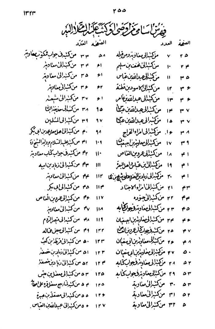 كتاب الاختصاص للشيخ المفيد قدس سره المطبوع في طهران سنة 1379 الهجرية القمريّة ص 138 قال كتاب معاوية الي علي عليه السّلام و جواب عليّ عليه السّلام علي يد الطّرمّاح اليه كتب معاوية بن ابي سفيان الي علي بن ابي طالب صلوات اللّه عليه بسم اللّه الرّحمن الرّحيم امّا بعد يا عليّ لاضربنّك بشهاب قاطع لا يدكنه الرّيح و لا يطفأه الماء اذا اهتزّ وقع و اذا وقع نقب و السّلام فلمّا قرء عليّ عليه السّلام كتابه دعا بدواة و قرطاس ثم كتب بسم اللّه الرّحمن الرّحيم امّا بعد يا معاوية فقد كذبت انا عليّ بن ابي طالب و انا ابو الحسن و الحسين قاتل جدّك و عمّك و خالك و ابيك و انا الّذي أفنيت قومك في يوم بدر و يوم فتح و يوم احد و ذلك السّيف بيدي