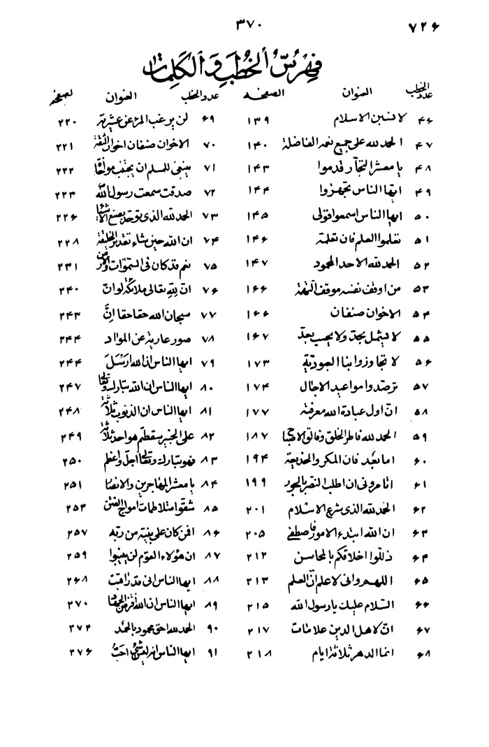 و لمّا كان كلامه عليه السّلام نورا لمن استضاء به فسمّيت مجموعتي هذه مصباح البلاغة في مشكوة الصّياغة و في توصيفه و تاليفه لقد حذيت حذو الرضيّ رضي اللّه عنه لا من حيث التّرسيل و التّقطيع بل من حيث الخطب و الاوامر و الكتب و الرّسائل دون الحكم و المواعظ الّتي جعلها الباب الثالث من الكتاب و ابتدءت بما ابتدء و صنعت كما صنع الاّ انّي قد بيّنت كلّ ما نقلت مأخذها و مسانيدها ان كانت لها سند و كلّما منها قطّعت في النّهج لو ظفرت بتمامها اكتبها و اشير الي مدركها و ما من الخطب و الكلم و الكتب و الحكم التي ظفرت بها لا كتب تمام ما ظفرت به و لا اقطّعها و هذا بحوله و قوّته و توفيقه و ربّما يري في اثناء هذا الكتاب تكرار في الخطبة او الكلام او اللّفظ اعتذر كما اعتذر السيّد في النّهج بقوله و العذر في ذلك انّ روايات كلامه(عليه السّلام)تختلف اختلافا شديدا فربّما اتّفق الكلام المختار في رواية فنقل علي وجهه ثمّ وجد بعد ذلك