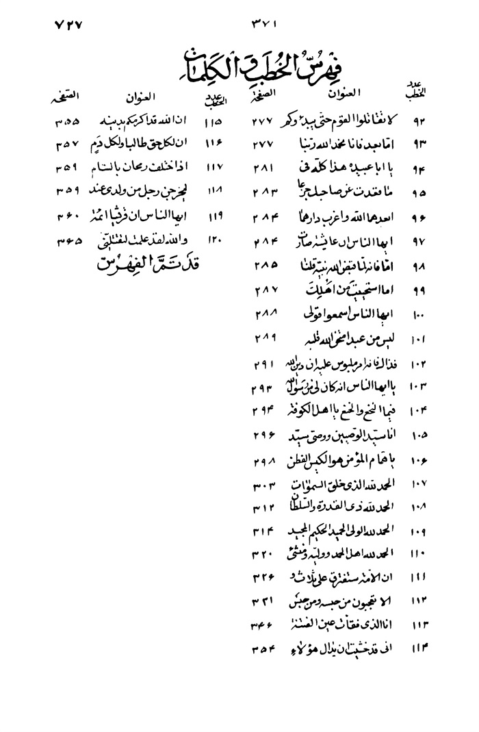 جنّة بقربه و خلّد في قصور مشيّدة و ملك من حور عين و حفدة و طيف عليه بكئوس و سكن حظيرة قدس في فردوس و تقلّب في نعيم و سقي من تسنيم و شرب من عين سلسبيل قد مزّج بزنجبيل ختم بمسك و عنبر مستديم للملك(للحبور)مستشعر للعشور(للسّرور)يشرب من خمور في روض مغدق ليس يترف في شربه هذه منزلة من خشي ربّه و حذّر نفسه و تلك عقوبة من عصي منشئه و سوّلت له نفسه معصيته لهو قول فصل و حكم عدل خير قصص قصّ و وعظ نصّ تنزيل من حكيم حميد نزل به روح قدس مبين من عند ربّ كريم علي قلب نبيّ مهتد رشيد صلّت عليه سفرة مكرّمون بررة و عدت بربّ حكيم عليم قدير رحيم من شرّ عدوّ لعين رجيم يتضرّع متضرّعكم و يبتهل مبتهلكم و نستغفر ربّ كلّ مربوب لي و لكم ثمّ قرء بسم اللّه الرّحمن الرّحيم تلك الدّار الاخرة نجعلها للّذين لا يريدون علوّا