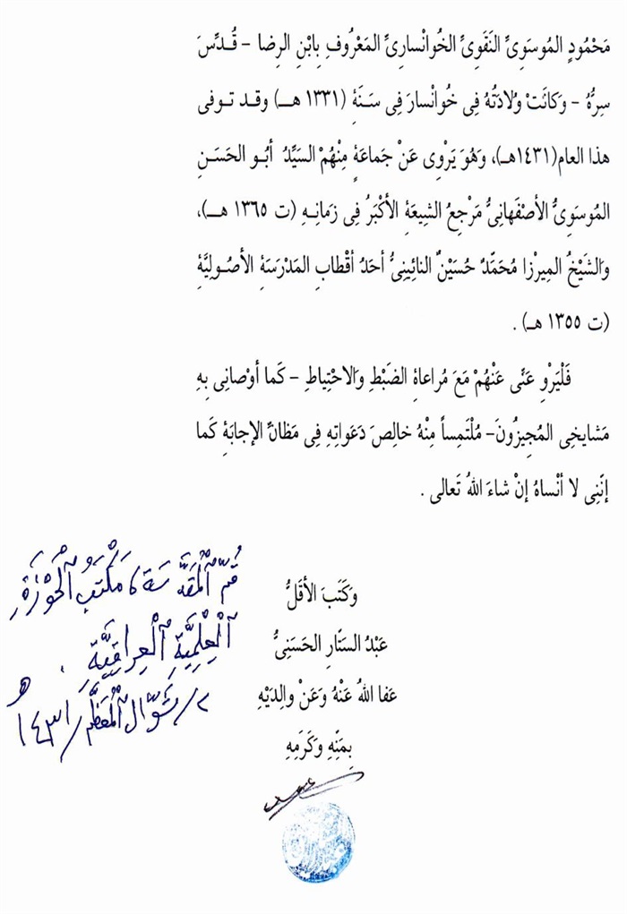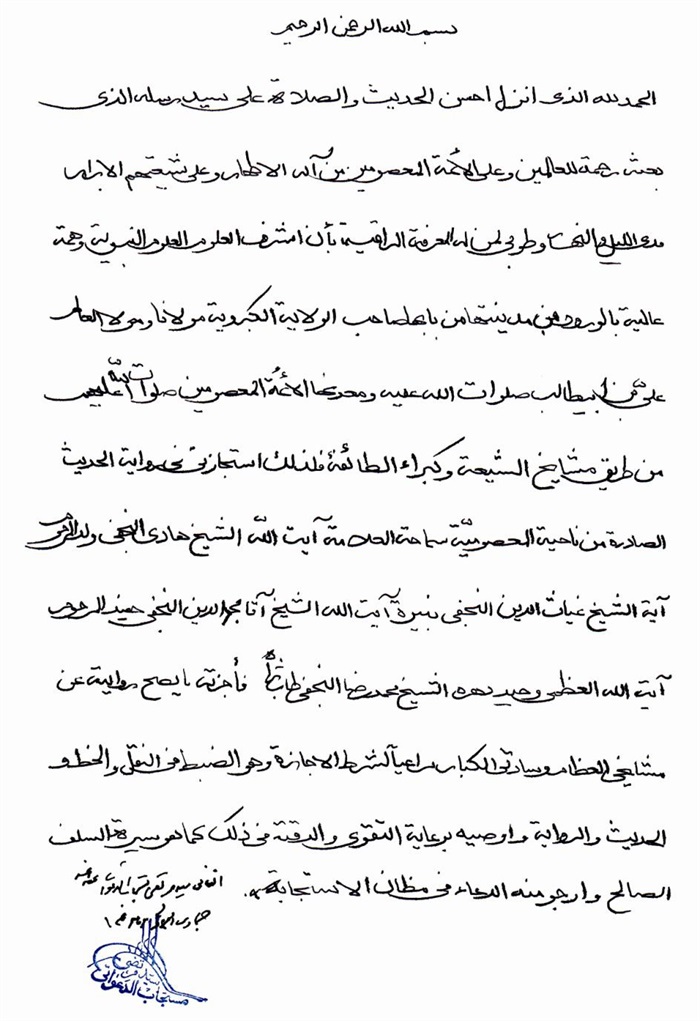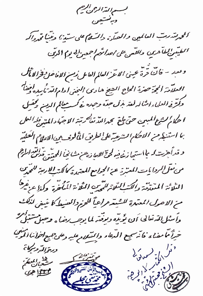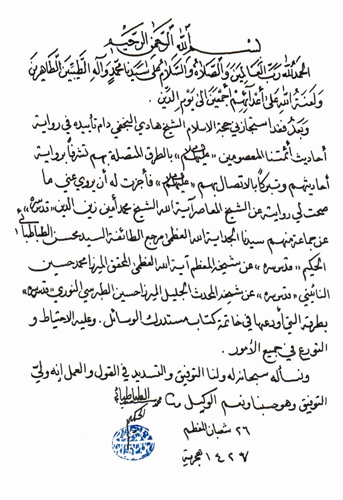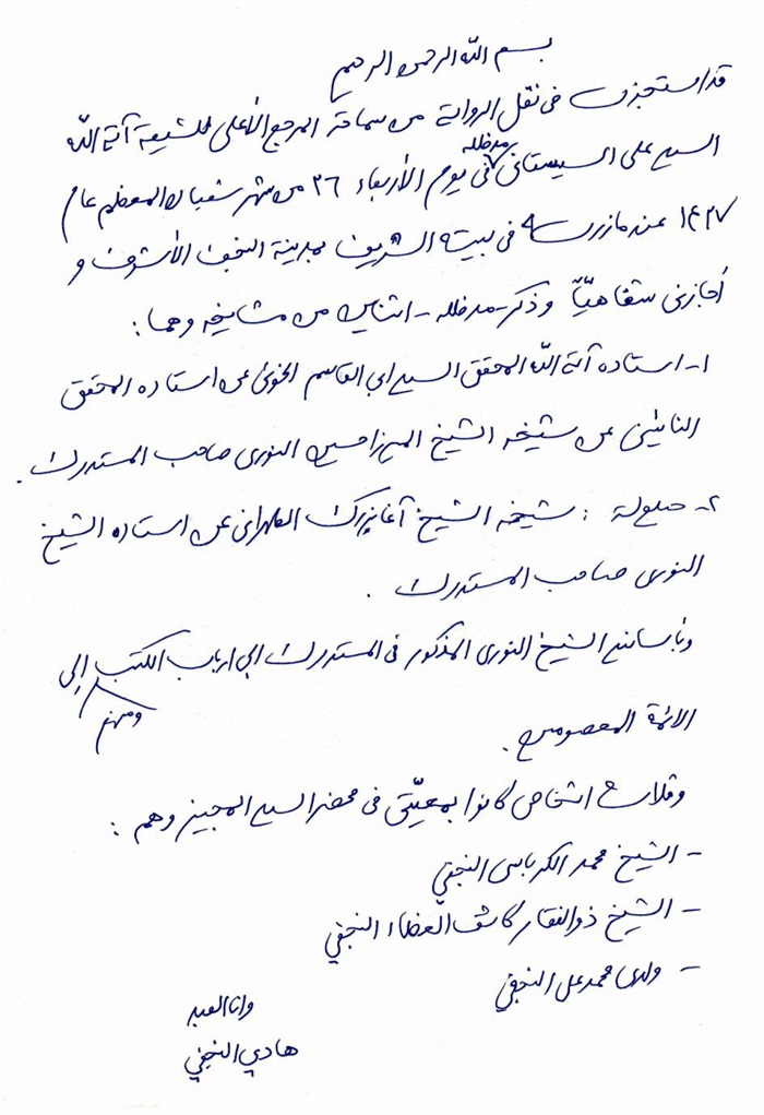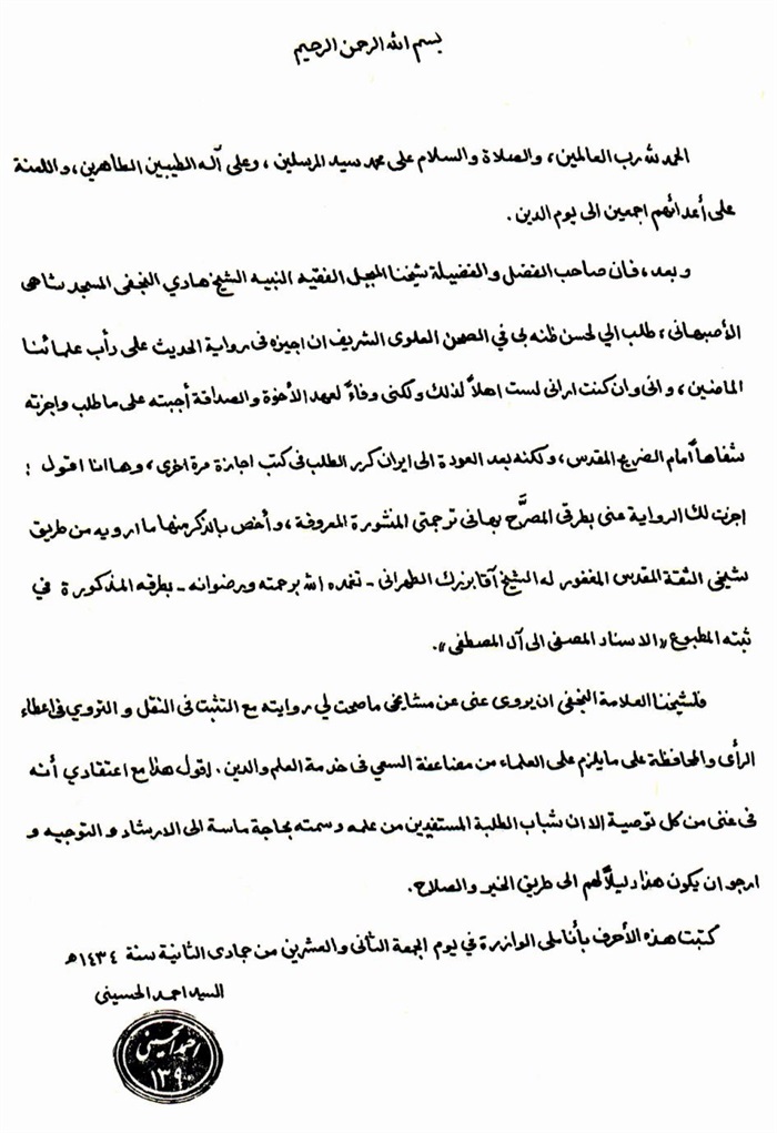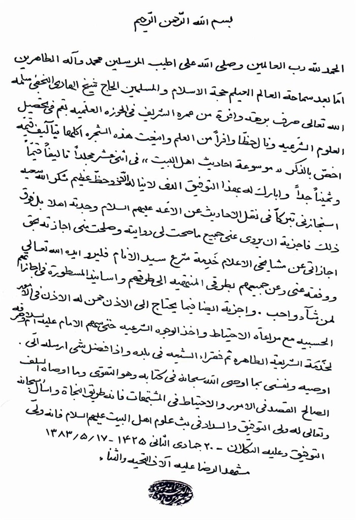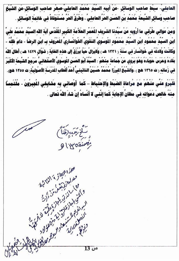 ثمّ لابدّ أن أذکر أنّ لي إجازات أُخرى غير مذکورة في هذه الرسالة وهي جميع إجازاتي الکثيرة في الأمور الحسبية فإنّها غير مذکورة هنا إلّا ما ورد في ذيلها الإجازة الروائية.