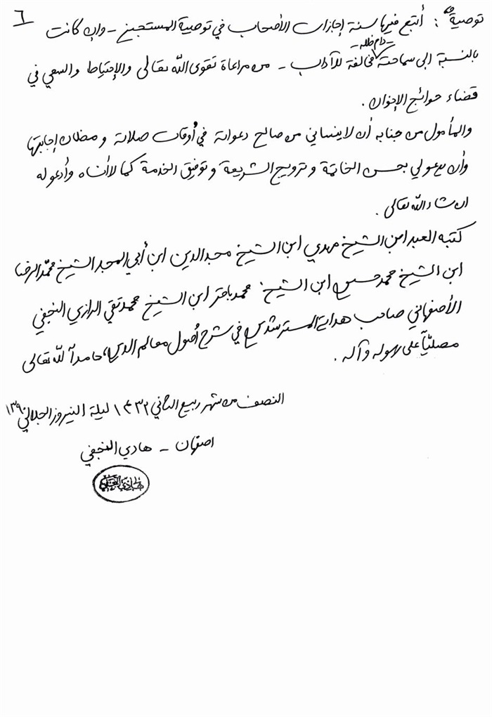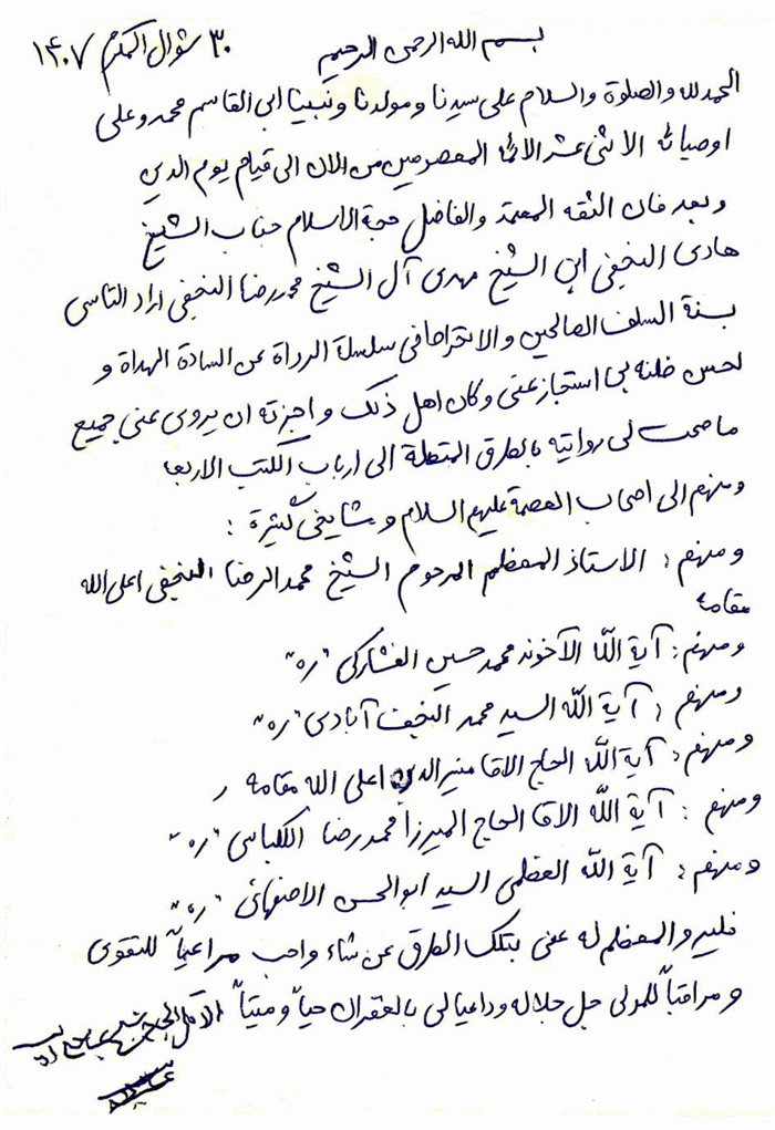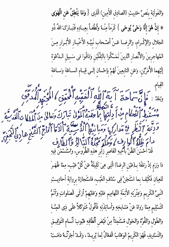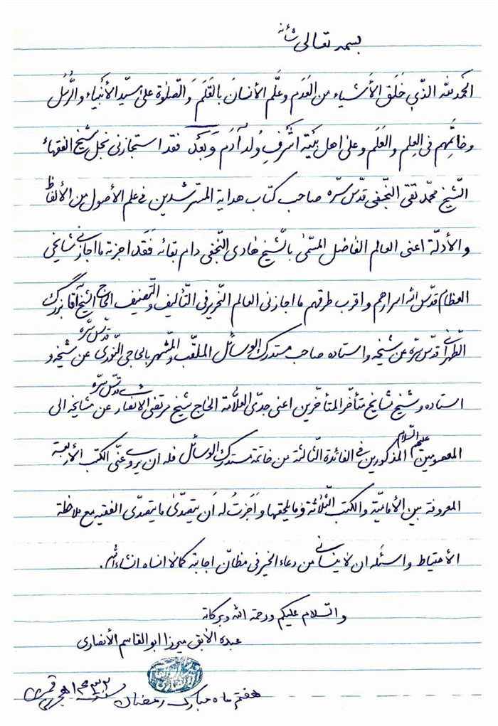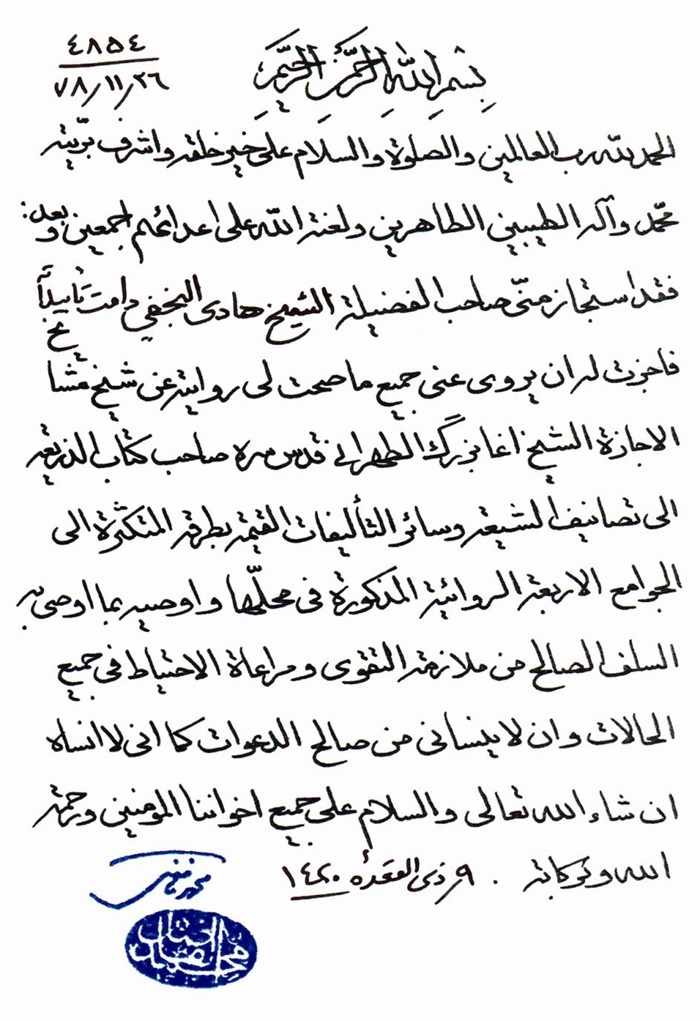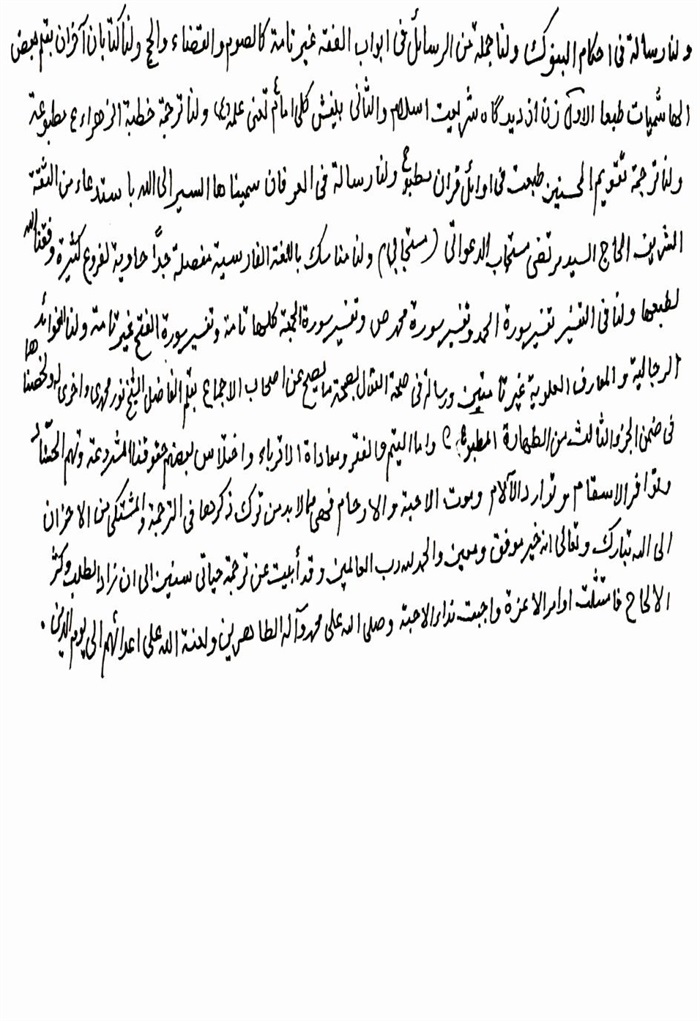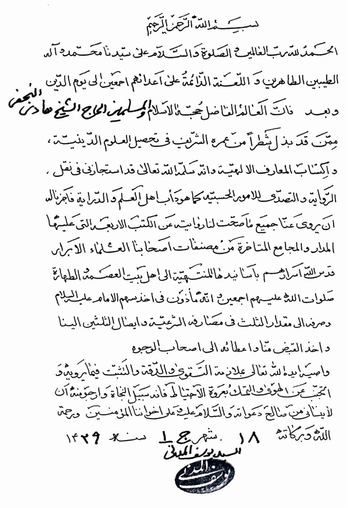 ثمّ لابدّ أن أذکر أنّ لي إجازات أُخرى غير مذکورة في هذه الرسالة وهي جميع إجازاتي الکثيرة في الأمور الحسبية فإنّها غير مذکورة هنا إلّا ما ورد في ذيلها الإجازة الروائية.