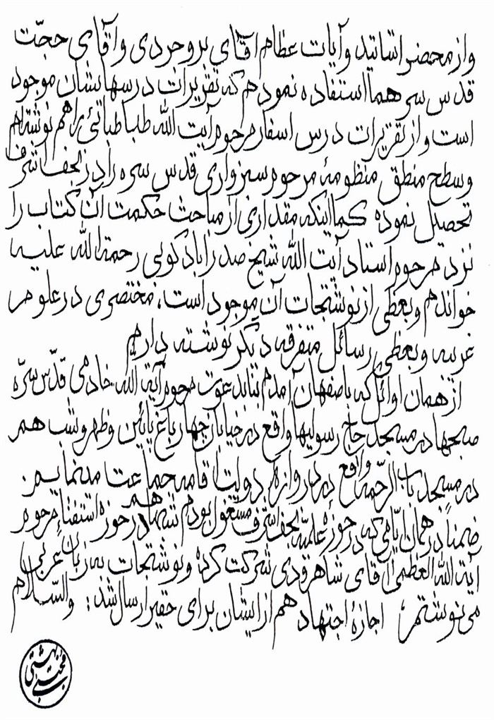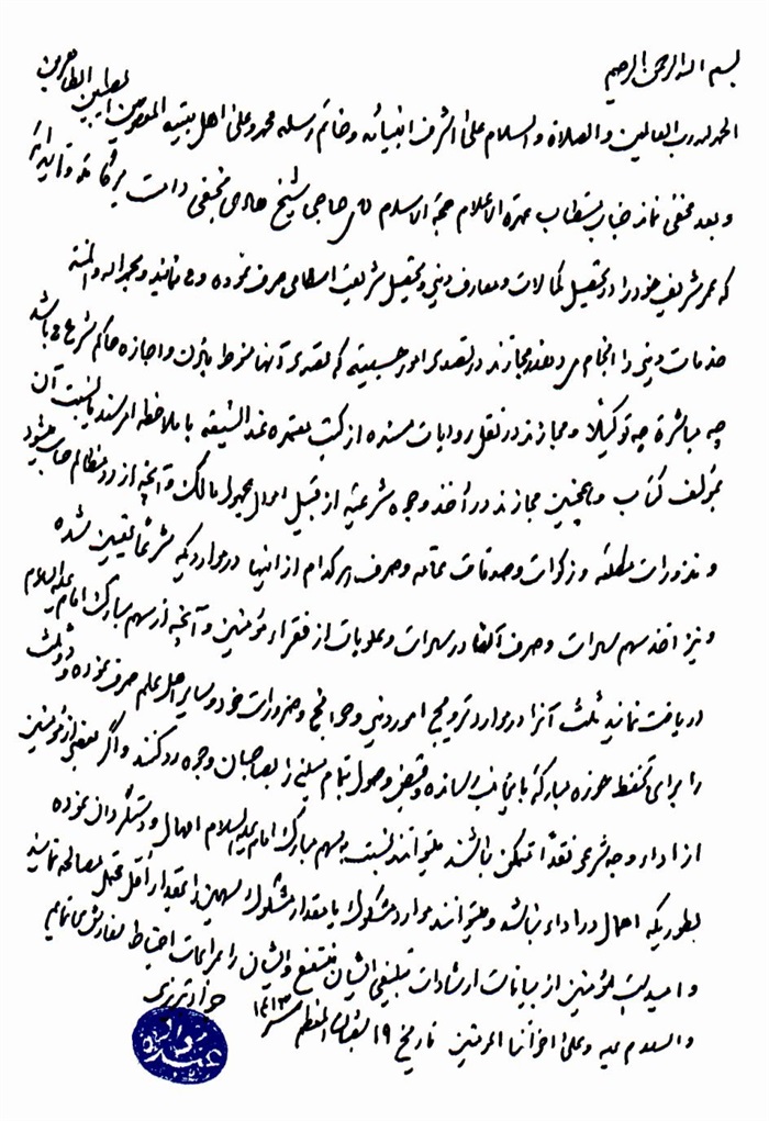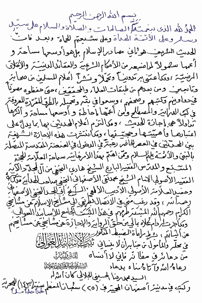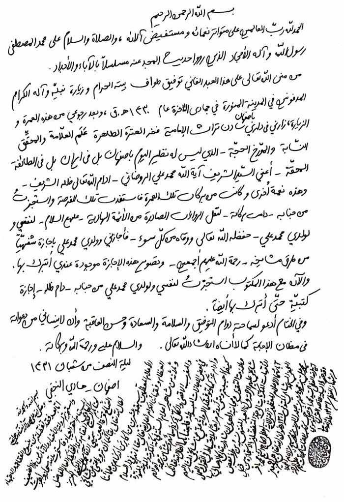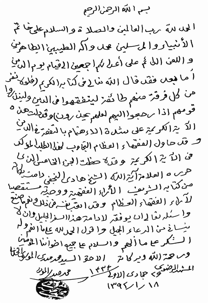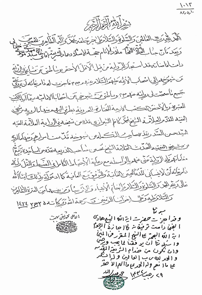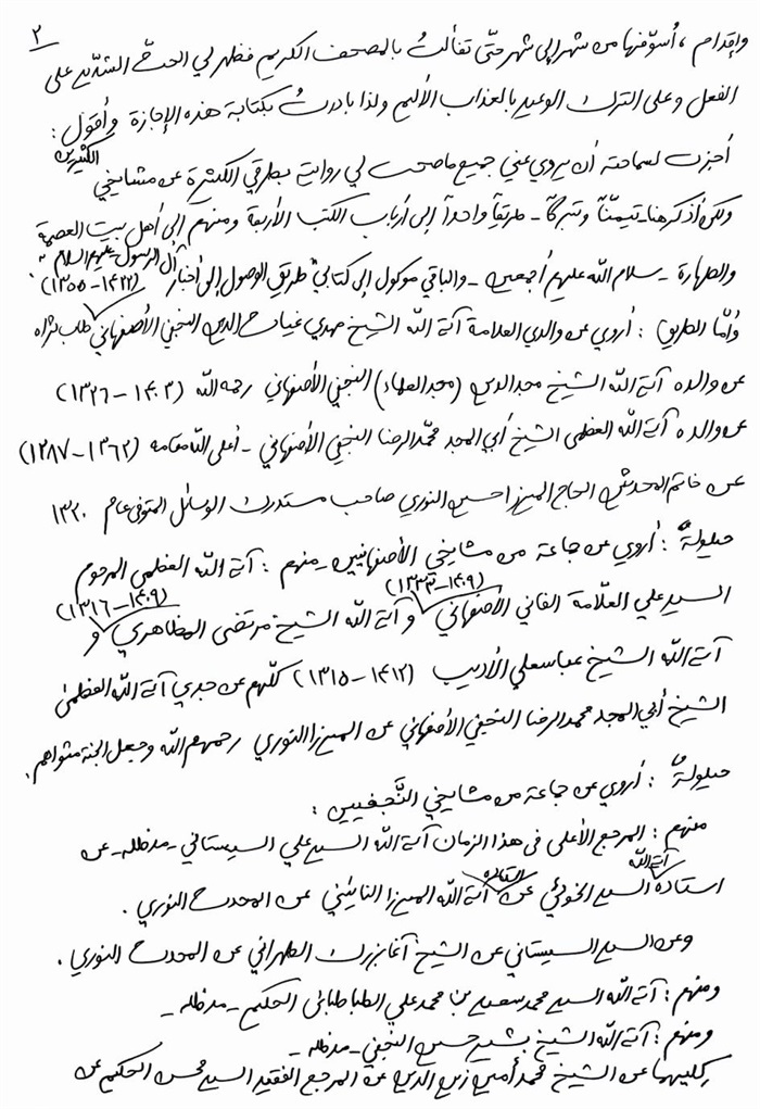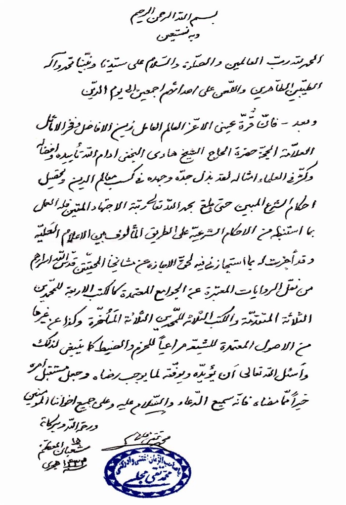 ثمّ لابدّ أن أذکر أنّ لي إجازات أُخرى غير مذکورة في هذه الرسالة وهي جميع إجازاتي الکثيرة في الأمور الحسبية فإنّها غير مذکورة هنا إلّا ما ورد في ذيلها الإجازة الروائية.