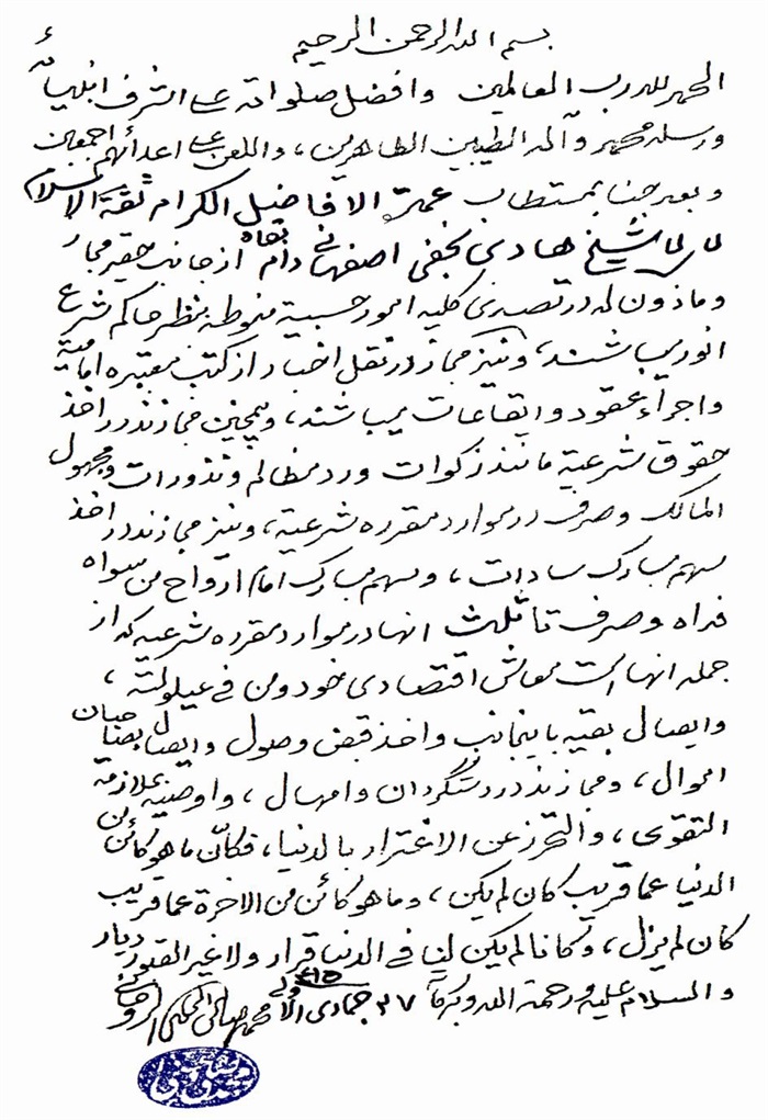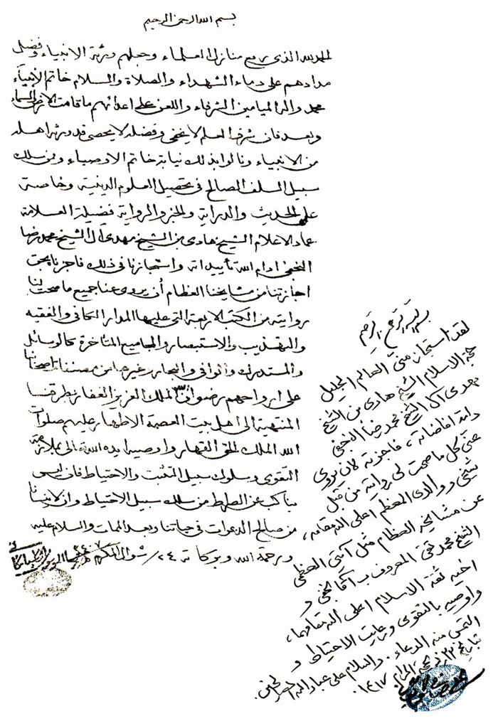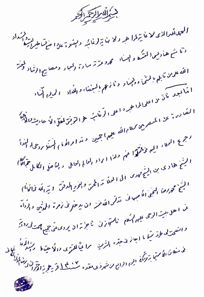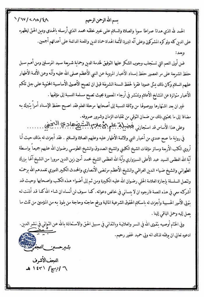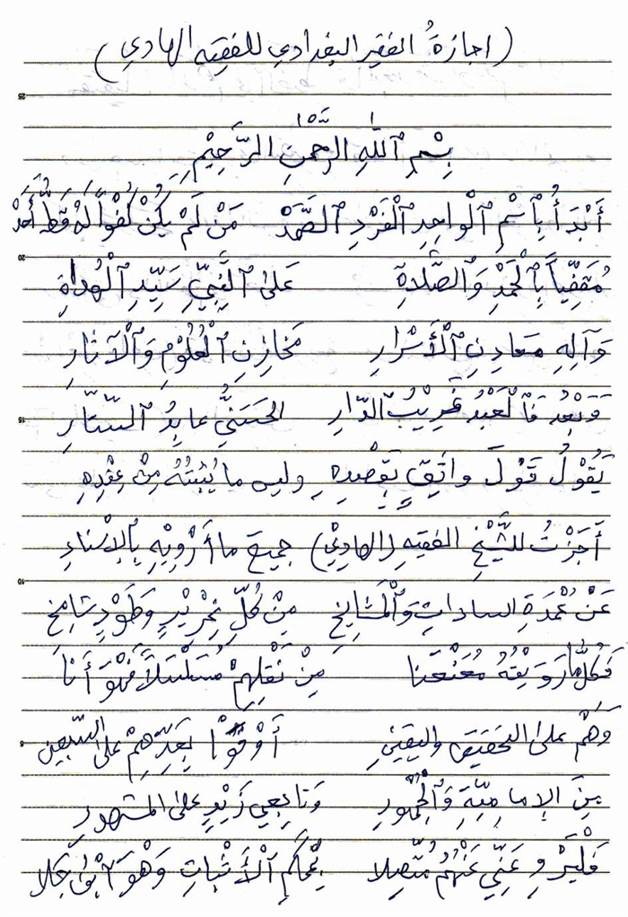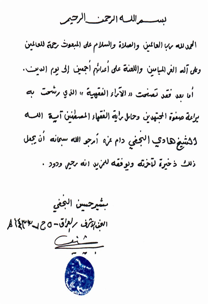 إجازة الفقير البغدادي إلى الفقيه الهادي.................................................. 316