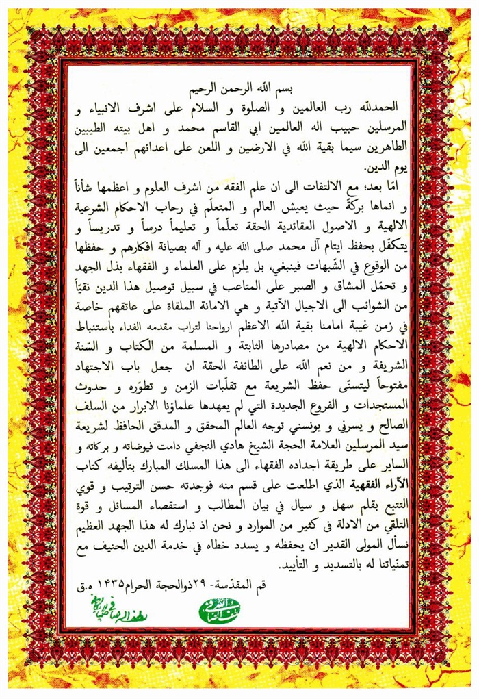 تقريظه (دام ظله) على کتابي الآراء الفقهية.................................................... 331