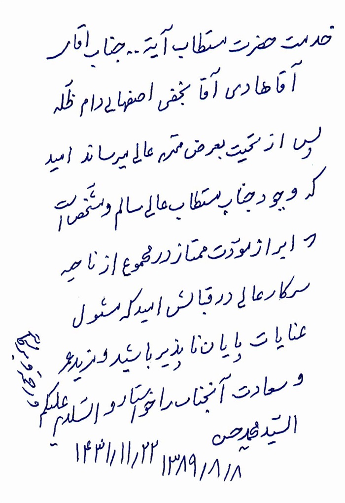 مضافاً إلى أنّي إستجزتُ من بعض آخر نحو آيةالله السيّد محمّدباقر ابن السيدأحمد ابن السيّد محمّد المصطفوي الکاشاني (قدس سره) (1350-1435) فأجازني شفهياً في يوم الأربعاء 14 شهر ذي القعدة الحرام 1432 / 20 مهر 1390ش بواسطة الشيخ عبدالحسين جواهر کلام (دامت برکاته) .