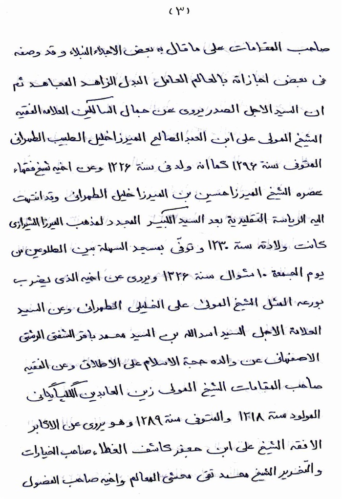 وإلى هنا أختم الکلام في المقدمة وأشرع بالمقصود وأذکر مشايخي بحسب تاريخ صدور إجازتهم - إلّا والدي (قدس سره) قدّمته لحقّ الأُبوة مع أنّه ثاني مَنْ أجازني - وتراجمهم وقد أدرجت إجازاتهم بعد تراجمهم بدون ذکر الألقاب اعتذاراً منهم.ثمّ أذکر إذا کان عندي منهم إجازة إجتهاد أو تقريظ على کتاب أو رسالة صدرت باسمي أو تراجمهم بخطوطهم أو محاضرة ألقيتها في شأنهم ونحوها.