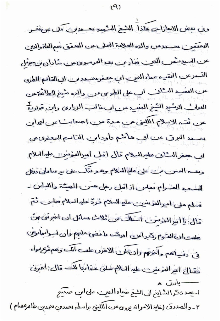 ومثله بالظفر والوجود مثل الفقه الرضوي لمّا وجده أميرحسين عند جماعة من أهالي قم؛ وصرّح الصدوق وغيره بوجود جملة من مکاتبات الأئمّة (علیه السلام) وتوقيعاتهم عند بعض الشيعة؛ فکم رووا وأسندوه إلى ذلك الوجود؛ لکنّ الانصاف أنّ المتلقّى يداً بيد ممّن يرجع إليه من علمائنا اعتبار الإجازة في الرواية، بل والفتوى عموماً أو خصوصاً؛ وعلى ذلك طريقتهم وسيرتهم الکاشفة عن أنّ ذلك مأخوذ ومتلقى عن شيوخهم؛ فينبغي أنّ المتورّع يستجيز من مشايخه ما استجازوا فيه، ويستجيز أيضاً في أن يجيز؛ وکلّما لم تحصل له الإجازة فيه لا يرويه.