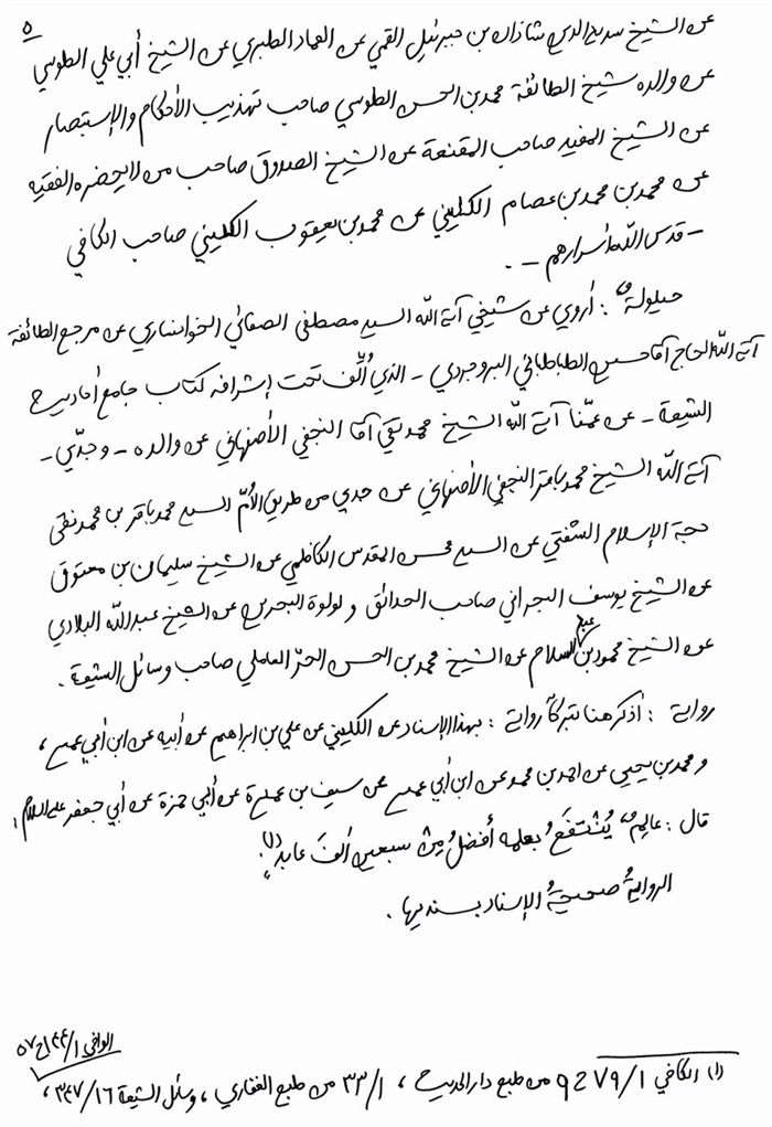 وعليه فلا يحتاج إلى إجازة الغير في أحاديثهم وما ورد عنهم بطريق تحصيل الظنّ الاطمئناني بأنّه منهم؛ حتّى لو قال المتبحّرون(3) [من] العلماء في فتوى خاصّة وبه رواية