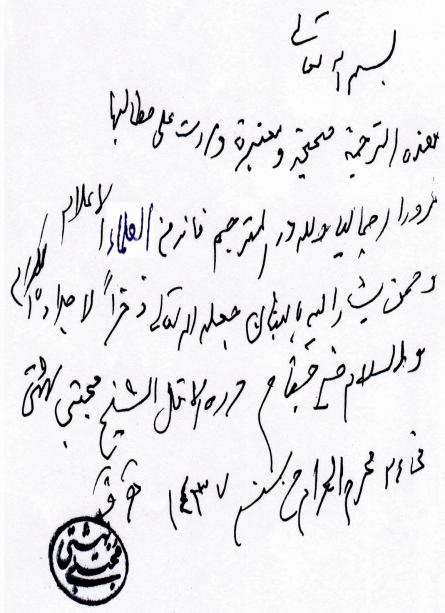 ما کتبه بخطّه حول تصديق ترجمته......................................................... 410