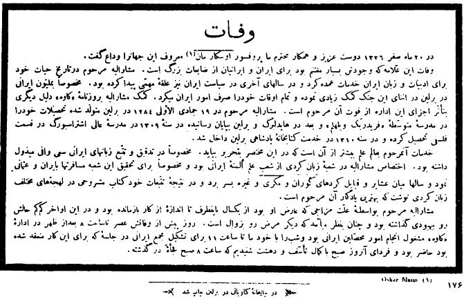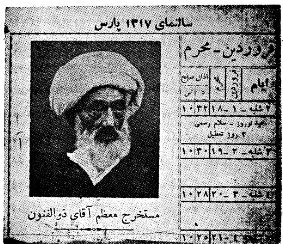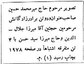 (1) شرح حال این شخص را مرحوم مشار در «مؤلّفین کتب چاپی 6: 891- 893» از مجله« یادگار 3 : 10 : 25» آورده و پنج اثر قلمی او را که چاپ شده بر شمرده و در آنجا وفاتش بروز (یکشنبه) 22 صفر 1354 مطابق چهارم خرداد 1314 قید گردیده است.