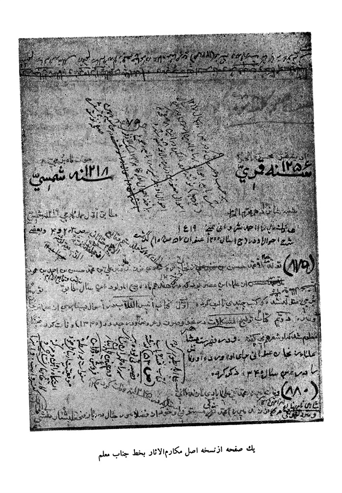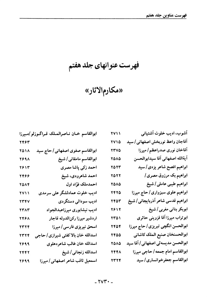 الحمد للّه الاول بلا بداية، و الاخر بلا نهاية، و الصلوة و السلام على محمد و آله أولى النبوة و الولاية. و بعد، كتاب «مكارم الاثار» تأليف اين عبد ضعيف محمد على معلم حبيب آبادى قريب بچهل سال قبل از اين شروع در تأليفش شده، و پس از مدتى تا اندازه ئى كه مقصود بود شرح احوال رجال علمى مائتين 13 و 14 هجرى قمرى در آن نگارش يافته، و تأليف آن بخاتمت گرائيد. و چنان كه در ص 18 مقدمه ذكر كرده ايم، در آخر هر ترجمه از هر سالى، و هم بعد از ترجمه آخر هر سالى قدرى اوراق بياض وا گذاشتيم، و بطورى كه پيش بينى شده بود هماره اطلاعاتى تازه حاصل، و بتدريج در بسيارى از آنها مطالبى تحرير يافته و بدان الحاق ميشد، چنان كه بسيارى از تراجم متقدمه مستقله، يا تكميلاتى براى تراجم معنونه؛ سالها پس از تحرير تراجم متأخره يا انجام عناوين مترجمه، در بياض هاى پيش بينى شده سمت تحرير يافته، و هماره اين روش و دستور جامه عمل بخود مى پوشيد، و اغلب آن بياض ها بسواد رسيد، و اوراق بسيارى از اين مسودات و مبيضات بر روى هم متراكم و مجتمع مى- گرديد، ليكن بهيچ وجه اسباب طبع و نشر بلكه تدوين و تجليد آن اوراق فراهم نميشد.