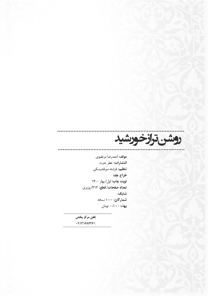 عنوان و نام پديدآور:روشن تر از خورشید : وظایف امت حضرت مهدی علیه السلام در عصر غیبت/ احمدرضا مرتضوی.