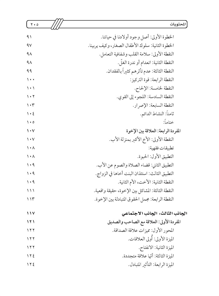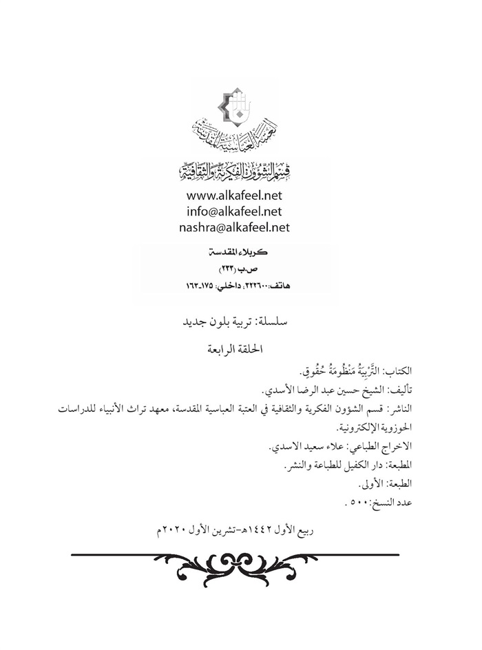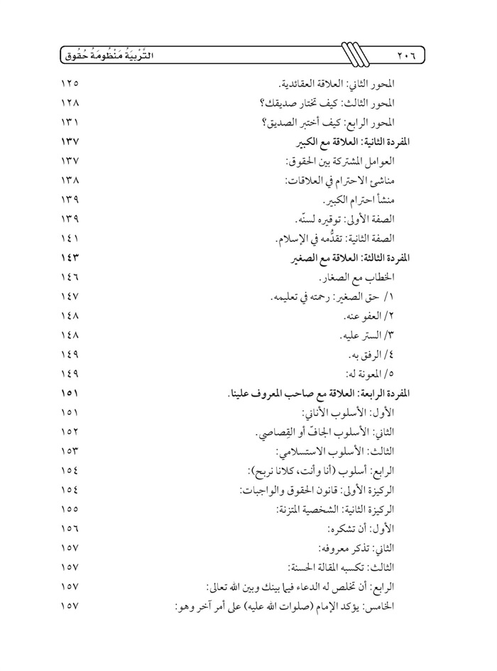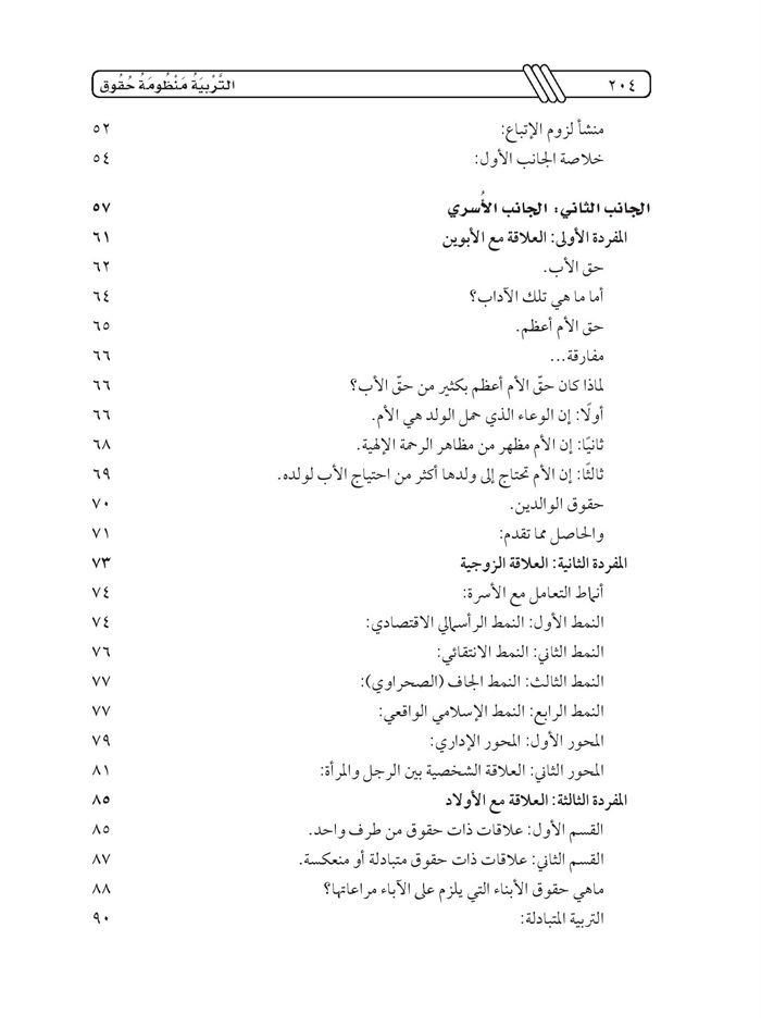 والواجبات)، والتي لولاها لتحولت الحياة إلى غابة تعجّ بالوحوش الكاسرة، وهي مستفادة من رسالة الحقوق للإمام زين العابدين (عَلَيْهِ اَلسَّلاَمُ)، تضمنت بيان العديد من الحقوق التي تنبغي مراعاتها وأداؤها، والمطلوب هي معرفة الحقوق فيها، ونقلها إلى الأولاد عملياً، بأن يعمل الوالدان على تطبيقها بمرأى ومسمع منهم، ثم دفعهم إلى أداء ما يترتب عليها من سلوكيات وأفعال خارجية.