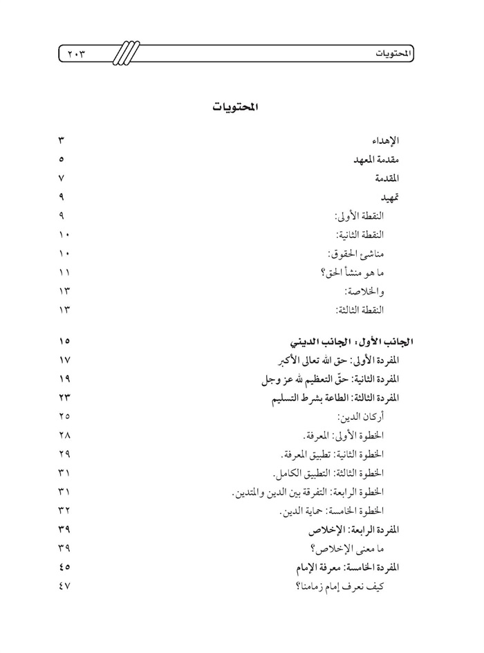 ثم إن تراثنا الديني لم يعدم الخطوط العامة والمرتكزات الأساسية لتلك الجوانب -وغيرها-، وإن خير ما يمكن أن يُنظّم لنا خطوات العمل المنهجي فيها هو ما وصل إلينا من تراث أئمتنا (صلوات الله عليهم)، وبالأخص ما وصلنا من رسالة الحقوق للإمام زين العابدين (عَلَيْهِ اَلسَّلاَمُ)، حيث اخترنا من هذه الرسالة بعض ما يدخل ضمن هذه الجهات الأربعة للحقوق موضوع الكتاب.