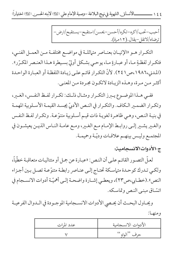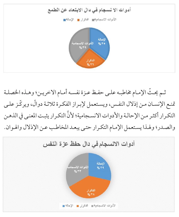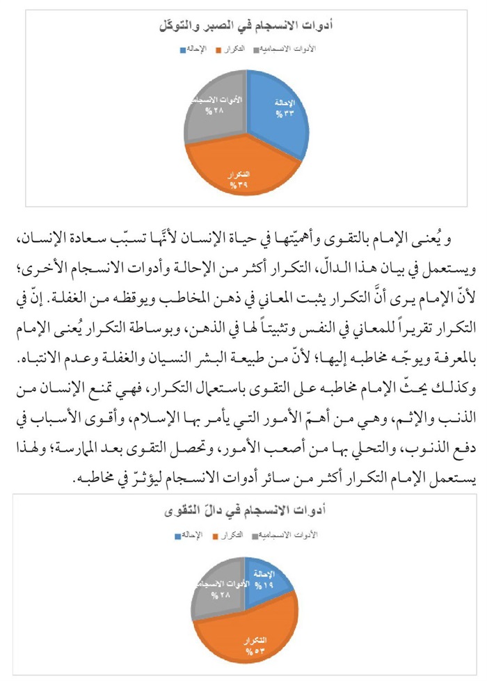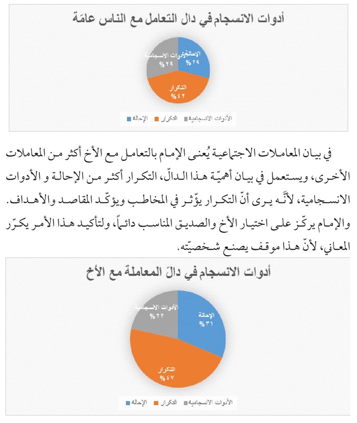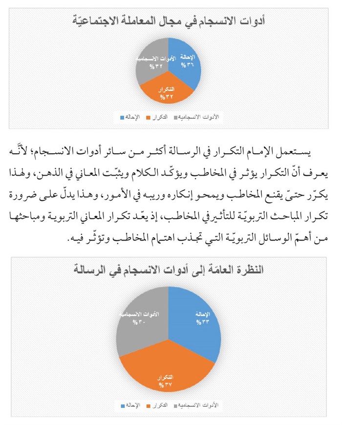 منهج یتكئ علیه، فقد اقتضت طبيعة البحث الإستناد علی المنهج الوصفي- التحليلي الذي يحاول الوقوف علی الدوال الاصلية والفرعية في الرسالة بوساطة تحلیل التكرار والإحالة والأدوات الإنسجامية و...الی جانب الأدوات التكميلية كالتعليق والإحصاء وتوثيق المادة المنقولة استشهادا بالمصادر الوثيقة.