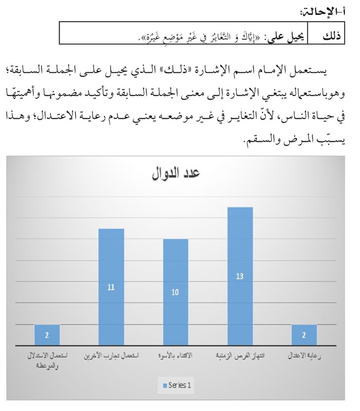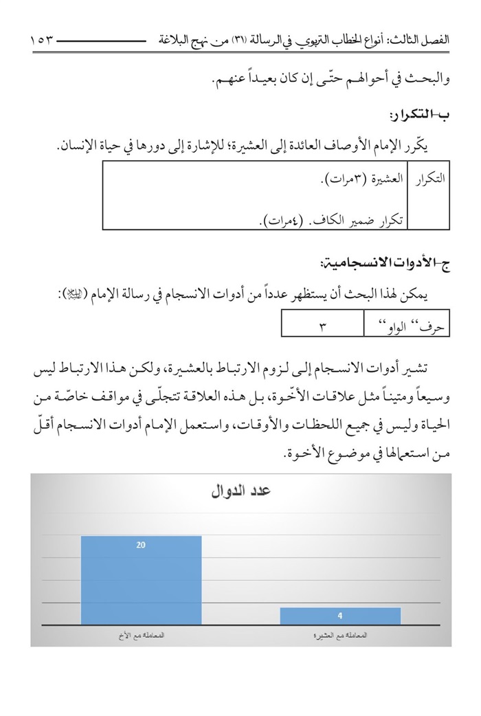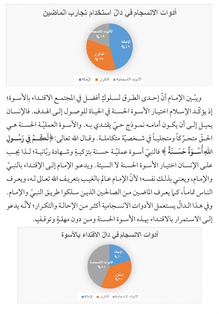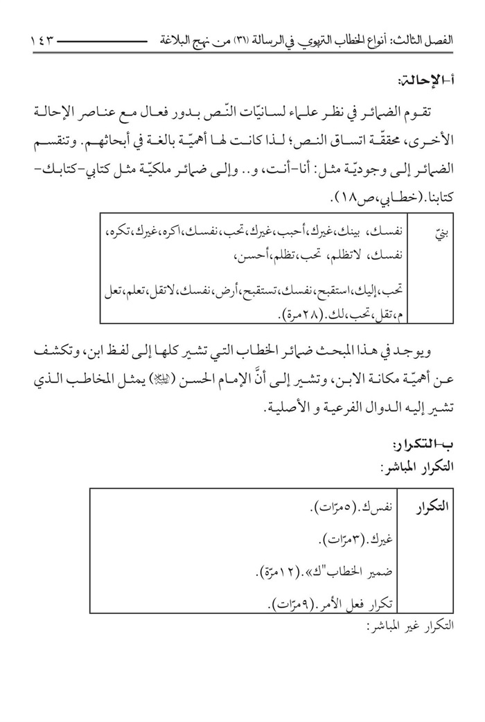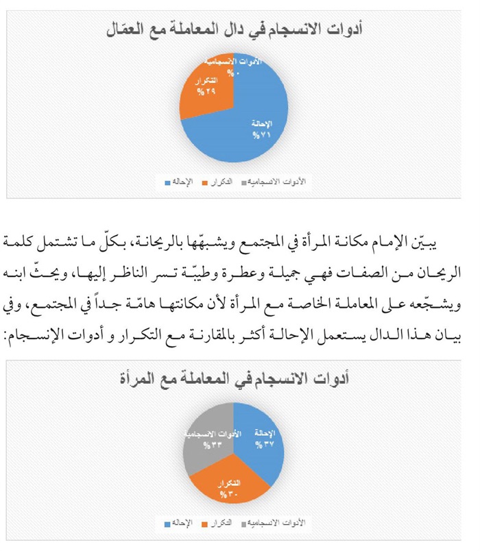منهج یتكئ علیه، فقد اقتضت طبيعة البحث الإستناد علی المنهج الوصفي- التحليلي الذي يحاول الوقوف علی الدوال الاصلية والفرعية في الرسالة بوساطة تحلیل التكرار والإحالة والأدوات الإنسجامية و...الی جانب الأدوات التكميلية كالتعليق والإحصاء وتوثيق المادة المنقولة استشهادا بالمصادر الوثيقة.