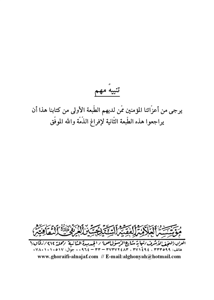 يرجى من أعزَّائنا المؤمنين ممَّن لديهم الطَّبعة الأولى من كتابنا هذا أن يراجعوا هذه الطَّبعة الثَّانية لإفراغ الذِّمَّة والله الموفِّق