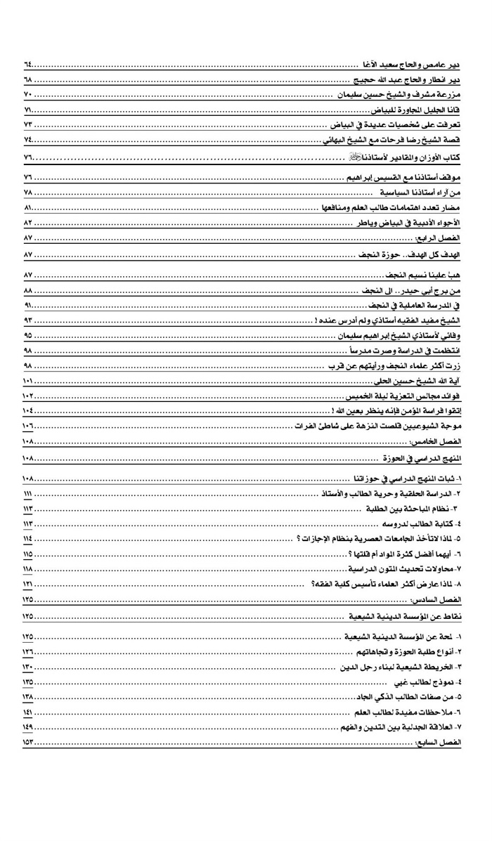 وأعتذر من أعزائي الطلبة إذا غلب الجانب الذاتي في هذا الكتاب ، فإنما هو حديث عن النفس ، ليستفيد منه الغير ، أعاننا الله على أنفسنا ، ورزقنا خيرها ، وأعاذنا من شرها . كما أعتذر من الذين ذكرتهم لماماً ولم أستوف الحديث عنهم ، أمثال مراجعنا الراحلين السيد محسن الحكيم ، والسيد عبد الهادي الشيرازي ، والسيد أبي القاسم الخوئي ، والسيد محمود الشاهرودي ، والسيد مهدي الشيرازي ، والسيد حسين الحمامي ، والسيد محمد باقر الصدر ، رضوان اللهعليهم ، ممن عاصرتهم أو درست عندهم ، لأن الحديث عن كل واحد من هؤلاء الكبار ، يحتاج الى كتاب خاص ، أو فصول .